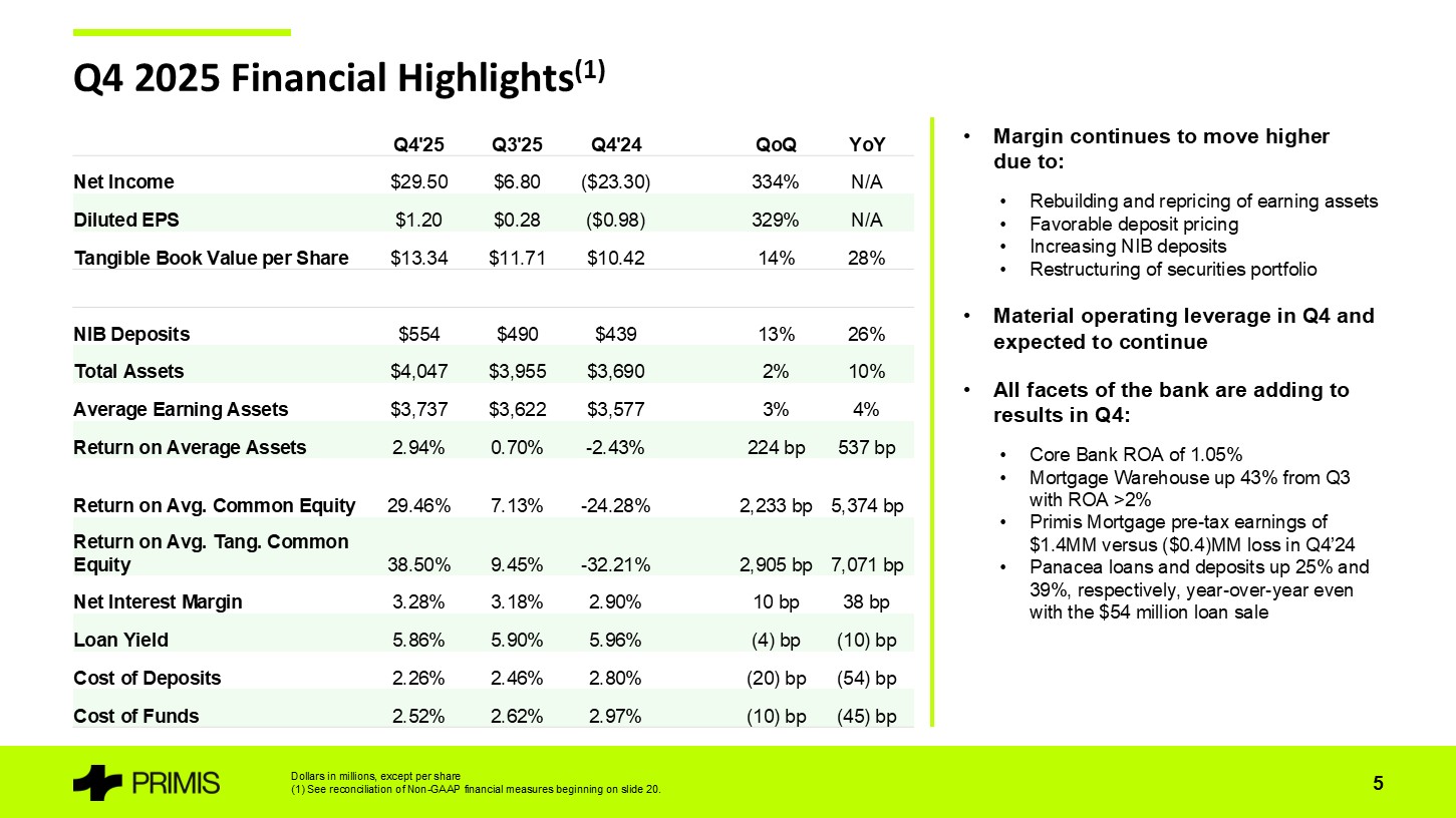 Forward - Looking Statements This presentation and certain of our other filings with the Securities and Exchange Commission contain statements that constitute “forward - looking statements” within the meaning of, and subject to the protections of, Section 27 A of the Securities Act of 1933 , as amended, and Section 21 E of the Securities Exchange Act of 1934 , as amended . All statements other than statements of historical fact are forward - looking statements . Such statements can generally be identified by such words as "may," "plan," "contemplate," "anticipate," "believe," "intend," "continue," "expect," "project," "predict," "estimate," "could," "should," "would," "will," and other similar words or expressions of the future or otherwise regarding the outlook for the Company’s future business and financial performance and/or the performance of the banking industry and economy in general . These forward - looking statements include, but are not limited to, our expectations regarding our future operating and financial performance, including the preliminary estimated financial and operating information presented herein, which is subject to adjustment ; our outlook and long - term goals for future growth and new offerings and services ; our expectations regarding net interest margin ; expectations on our growth strategy, expense management, capital management and future profitability ; expectations on credit quality and performance ; and the assumptions underlying our expectations . Prospective investors are cautioned that any such forward - looking statements are not guarantees of future performance and involve known and unknown risks and uncertainties which may cause the actual results, performance or achievements of the Company to be materially different from the future results, performance or achievements expressed or implied by such forward - looking statements . Forward - looking statements are based on the information known to, and current beliefs and expectations of, the Company’s management and are subject to significant risks and uncertainties . Actual results may differ materially from those contemplated by such forward - looking statements . Factors that might cause such differences include, but are not limited to : instability in global economic conditions and geopolitical matters ; the impact of current and future economic and market conditions generally (including seasonality) and in the financial services industry, nationally and within our primary market areas ; changes in interest rates, inflation, loan demand, real estate values, or competition, as well as labor shortages and supply chain disruptions ; the impact of tariffs, trade policies, and trade wars (including reduced consumer spending, lower economic growth or recession, reduced demand for U . S . exports, disruptions to supply chains, and decreased demand for other banking products and services) ; the Company’s ability to implement its various strategic and growth initiatives, including its recently established Panacea Financial Division, digital banking platform, V 1 BE fulfillment service, Mortgage Warehouse division and Primis Mortgage Company ; the risks associated with the Life Premium Finance sale, including failure to achieve the expected impact to our operating results ; competitive pressures among financial institutions increasing significantly ; changes in applicable laws, rules, or regulations, including changes to statutes, regulations or regulatory policies or practices ; changes in management’s plans for the future ; credit risk associated with our lending activities ; changes in accounting principles, policies, or guidelines ; adverse results from current or future litigation, regulatory examinations or other legal and/or regulatory actions ; potential impacts of adverse developments in the banking industry highlighted by high - profile bank failures, including impacts on customer confidence, deposit outflows, liquidity and the regulatory response thereto ; potential increases in the provision for credit losses ; our ability to identify and address increased cybersecurity risks, including those impacting vendors and other fourth parties ; fraud or misconduct by internal or external actors, which we may not be able to prevent, detect or mitigate ; acts of God or of war or other conflicts, acts of terrorism, pandemics or other catastrophic events that may affect general economic conditions ; action or inaction by the federal government, including as a result of any prolonged government shutdown ; and other general competitive, economic, political, and market factors, including those affecting our business, operations, pricing, products, or services . Forward - looking statements speak only as of the date on which such statements are made . These forward - looking statements are based upon information presently known to the Company’s management and are inherently subjective, uncertain and subject to change due to any number of risks and uncertainties, including, without limitation, the risks and other factors set forth in the Company’s filings with the Securities and Exchange Commission, the Company’s Annual Report on Form 10 - K for the year ended December 31 , 2024 , under the captions “Cautionary Note Regarding Forward - Looking Statements” and “Risk Factors,” and in the Company’s Quarterly Reports on Form 10 - Q and Current Reports on Form 8 - K . The Company undertakes no obligation to update any forward - looking statement to reflect events or circumstances after the date on which such statement is made, or to reflect the occurrence of unanticipated events . Readers are cautioned not to place undue reliance on these forward - looking statements . 2 Non - GAAP Measures Statements included in this presentation include non - GAAP financial measures and should be read along with the accompanying tables . Primis uses non - GAAP financial measures to analyze its performanc