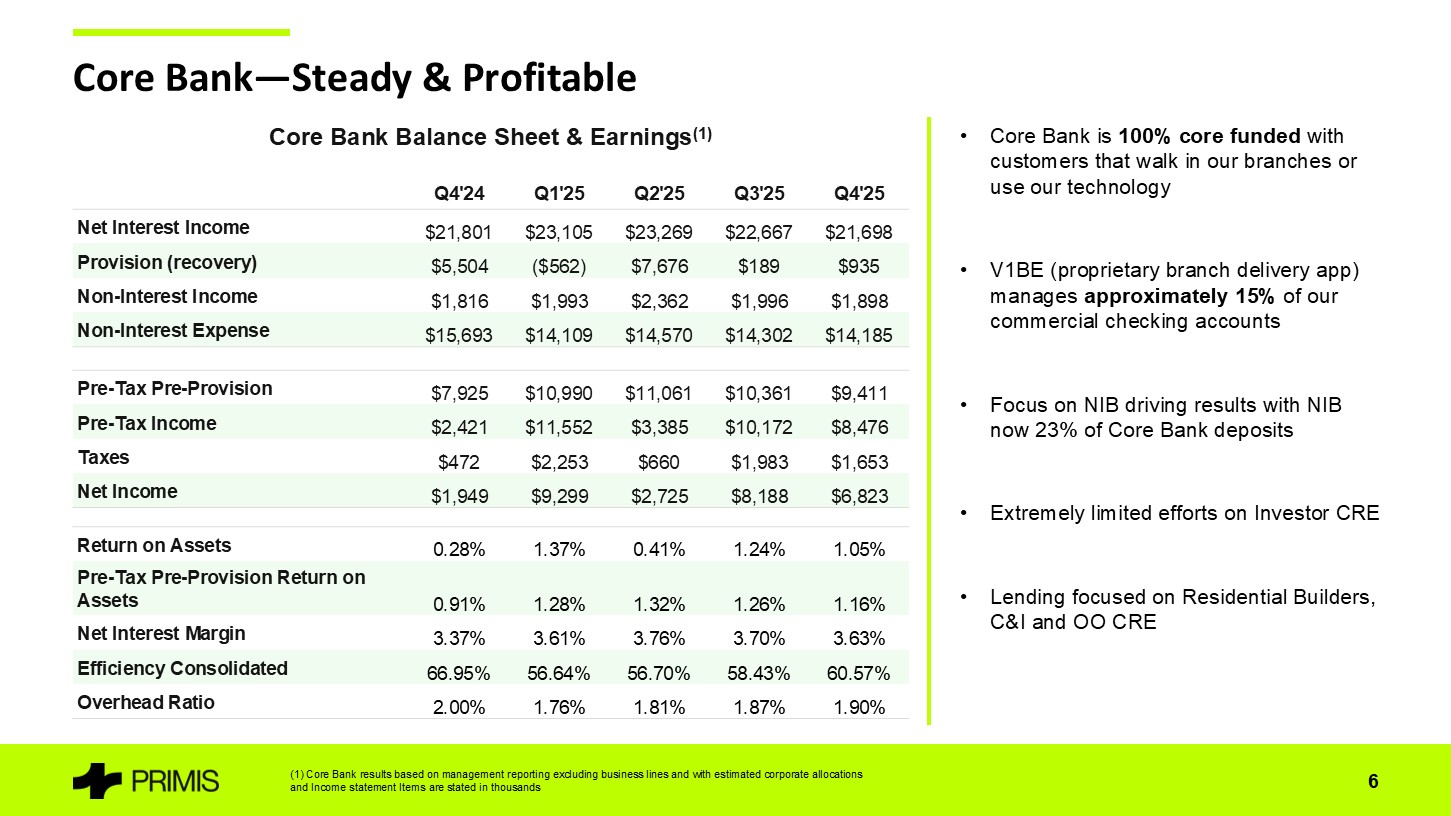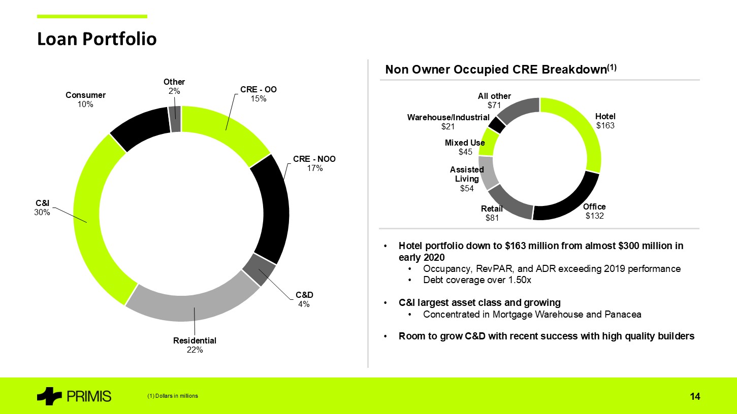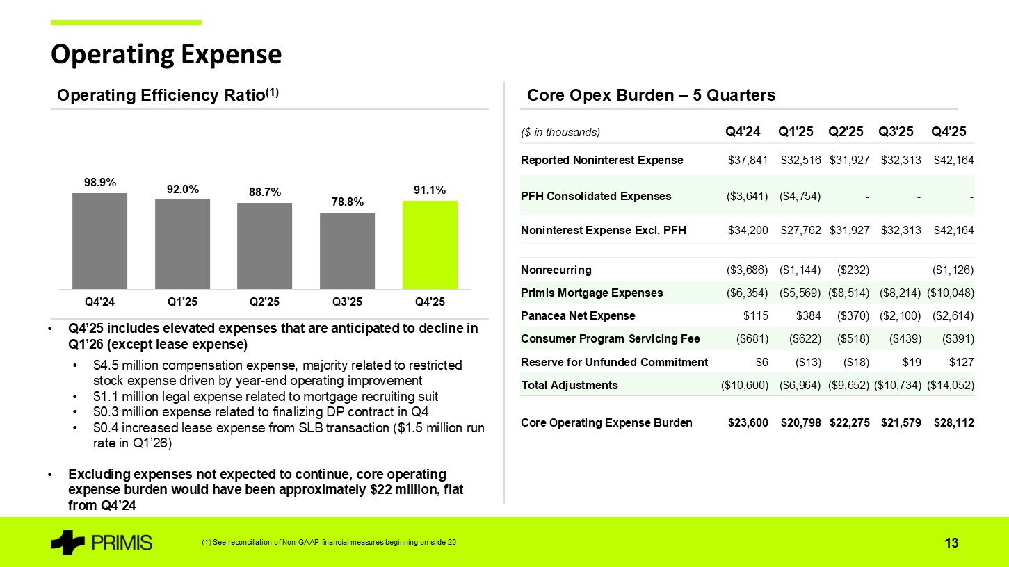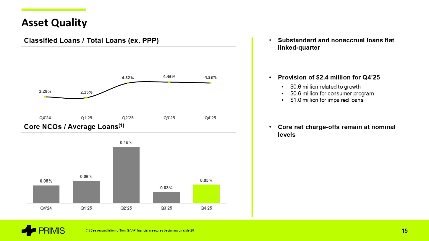 Deposits Dollars in Millions 12 • Approximately 15% of our commercial checking balances have our proprietary branching app • Even with vastly scalable lending strategies, we can grow deposits faster with zero pressure on the core bank’s relationship pricing or profitability • Core Bank benefitting from V1BE convenience for customers in our region and nationally beginning in the fourth quarter 2025 • Warehouse funding 10% - 15% of outstanding balances with NIB Deposit Composition – Q4’25 NIB Growth 26% YoY Demand Deposits 16.3% NOW Accounts 25.4% Money Market Accounts 21.8% Savings Accounts 27.2% Time Deposits 9.3% $554 $490 $478 $456 $439 Q4'25 Q3'25 Q2'25 Q1'25 Q4'24 Operating Expense (1) See reconciliation of Non - GAAP financial measures beginning on slide 20 13 • Q4’25 includes elevated expenses that are anticipated to decline in Q1’26 (except lease expense) • $4.5 million compensation expense, majority related to restricted stock expense driven by year - end operating improvement • $1.1 million legal expense related to mortgage recruiting suit • $0.3 million expense related to finalizing DP contract in Q4 • $0.4 increased lease expense from SLB transaction ($1.5 million run rate in Q1’26) • Excluding expenses not expected to continue, core operating expense burden would have been approximately $22 million, flat from Q4’24 Operating Efficiency Ratio (1) Core Opex Burden – 5 Quarters Q4'25 Q3'25 Q2'25 Q1'25 Q4'24 ($ in thousands) $42,164 $32,313 $31,927 $32,516 $37,841 Reported Noninterest Expense - - - ($4,754) ($3,641) PFH Consolidated Expenses $42,164 $32,313 $31,927 $27,762 $34,200 Noninterest Expense Excl. PFH ($1,126) ($232) ($1,144) ($3,686) Nonrecurring ($10,048) ($8,214) ($8,514) ($5,569) ($6,354) Primis Mortgage Expenses ($2,614) ($2,100) ($370) $384 $115 Panacea Net Expense ($391) ($439) ($518) ($622) ($681) Consumer Program Servicing Fee $127 $19 ($18) ($13) $6 Reserve for Unfunded Commitment ($14,052) ($10,734) ($9,652) ($6,964) ($10,600) Total Adjustments $28,112 $21,579 $22,275 $20,798 $23,600 Core Operating Expense Burden 91.1% 78.8% 88.7% 92.0% 98.9% Q4'25 Q3'25 Q2'25 Q1'25 Q4'24 Loan Portfolio (1) Dollars in millions 14 Non Owner Occupied CRE Breakdown (1) CRE - OO 15% CRE - NOO 17% C&D 4% Residential 22% C&I 30% Consumer 10% Other 2% • Hotel portfolio down to $163 million from almost $300 million in early 2020 • Occupancy, RevPAR, and ADR exceeding 2019 performance • Debt coverage over 1.50x • C&I largest asset class and growing • Concentrated in Mortgage Warehouse and Panacea • Room to grow C&D with recent success with high quality builders Hotel $163 Office $132 Retail $81 Assisted Living $54 Mixed Use $45 Warehouse/Industrial $21 All other $71