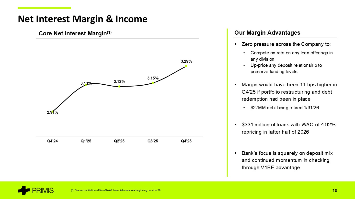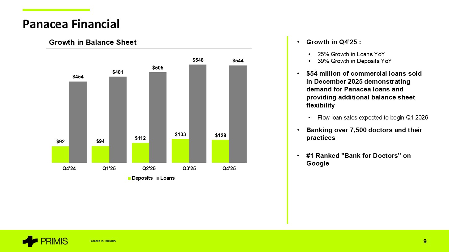 • Growth in Q4’25 results from: • Recruitment of #4 Nationwide VA lender in late Q1 • Recruitment of #1 originator team in Nashville, TN in late Q1 • Top 7 originators up 55% over Q2’24. • Recent hires have added >$500 million to annualized run - rate production • $32 million of construction - to - perm loans funded in Q4’25 • Limited profitability at origination but attractive rates during construction followed by wider than average GOS margin • Exiting 2025 without any seasonal volume decrease Primis Mortgage Dollars in Millions 8 Growth Despite Rate Environment $185 $111 $228 $202 $368 $402 Q2'23 Q4'23 Q2'24 Q4'24 Q2'25 Q4'25 Growth in Lock Volume Despite Low Volume Season • Growth in Q4’25 : • 25% Growth in Loans YoY • 39% Growth in Deposits YoY • $54 million of commercial loans sold in December 2025 demonstrating demand for Panacea loans and providing additional balance sheet flexibility • Flow loan sales expected to begin Q1 2026 • Banking over 7,500 doctors and their practices • #1 Ranked "Bank for Doctors" on Google Panacea Financial Dollars in Millions 9 Growth in Balance Sheet $92 $94 $112 $133 $128 $454 $481 $505 $548 $544 Q4'24 Q1'25 Q2'25 Q3'25 Q4'25 Deposits Loans