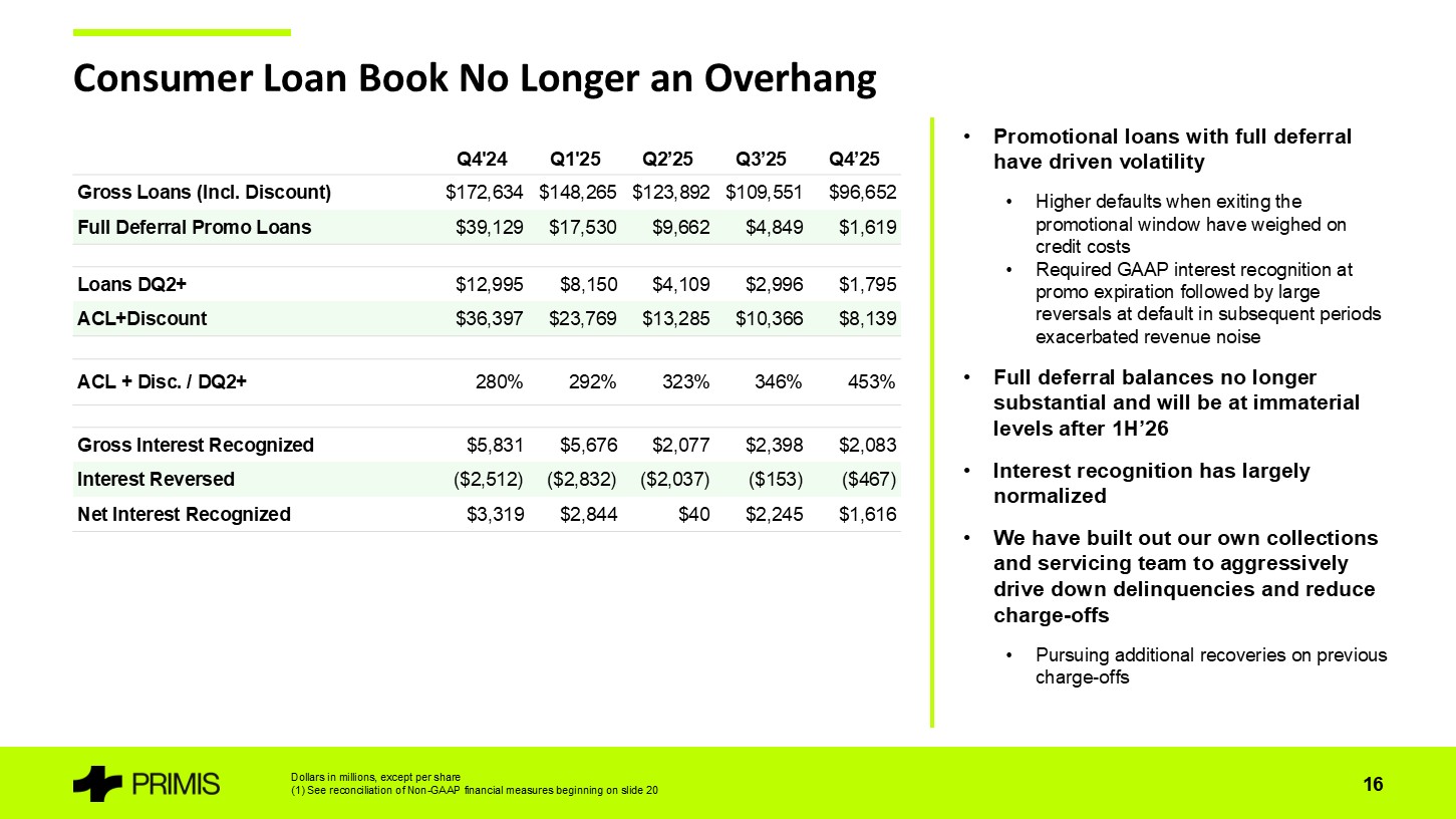 PPP) Core NCOs / Average Loans (1) 0.05% 0.06% 0.15% 0.03% 0.05% Q4'24 Q1'25 Q2'25 Q3'25 Q4'25 2.28% 2.15% 4.32% 4.46% 4.33% Q4'24 Q1'25 Q2'25 Q3'25 Q4'25 • Substandard and nonaccrual loans flat linked - quarter • Provision of $2.4 million for Q4’25 • $0.6 million related to growth • $0.6 million for consumer program • $1.0 million for impaired loans • Core net charge - offs remain at nominal levels • Promotional loans with full deferral have driven volatility • Higher defaults when exiting the promotional window have weighed on credit costs • Required GAAP interest recognition at promo expiration followed by large reversals at default in subsequent periods exacerbated revenue noise • Full deferral balances no longer substantial and will be at immaterial levels after 1H’26 • Interest recognition has largely normalized • We have built out our own collections and servicing team to aggressively drive down delinquencies and reduce charge - offs • Pursuing additional recoveries on previous charge - offs Consumer Loan Book No Longer an Overhang Dollars in millions, except per share (1) See reconciliation of Non - GAAP financial measures beginning on slide 20 16 Q4’25 Q3’25 Q2’25 Q1'25 Q4'24 $96,652 $109,551 $123,892 $148,265 $172,634 Gross Loans (Incl. Discount) $1,619 $4,849 $9,662 $17,530 $39,129 Full Deferral Promo Loans $1,795 $2,996 $4,109 $8,150 $12,995 Loans DQ2+ $8,139 $10,366 $13,285 $23,769 $36,397 ACL+Discount 453% 346% 323% 292% 280% ACL + Disc. / DQ2+ $2,083 $2,398 $2,077 $5,676 $5,831 Gross Interest Recognized ($467) ($153) ($2,037) ($2,832) ($2,512) Interest Reversed $1,616 $2,245 $40 $2,844 $3,319 Net Interest Recognized Capital Ratios (1) See reconciliation of Non - GAAP financial measures on slide 20 17 CET1 Ratio TCE / TA (1) 9.53% 8.62% 8.92% 9.35% 8.74% Q4'25 Q3'25 Q2'25 Q1'25 Q4'24 8.33% 7.48% 7.49% 7.82% 7.16% Q4'25 Q3'25 Q2'25 Q1'25 Q4'24