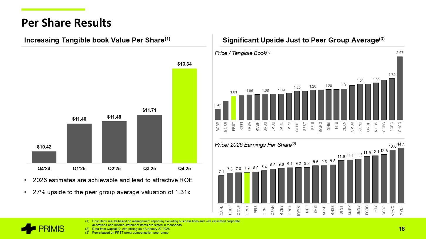 McLean, VA Glen Allen, VA 24 FRST Valuation Market Capitalization ($MM): Price / Book Value per Share: Price / Tangible Book Value (1) : Price / 2025 Estimated EPS (2) : Price / 2026 Estimated EPS (2) : $332 0.79x 1.01x 11.64x 7.94x Key Metrics Total Assets: Total Loans HFI: Total Deposits: TCE / TA (1) : ROAA: ROATCE (1) : Net Interest Margin: Cost of Core Bank Deposits: $4.05B $3.24B $3.40B 8.33% 2.94% 38.50% 3.28% 1.59% 4 • Margin continues to move higher due to: • Rebuilding and repricing of earning assets • Favorable deposit pricing • Increasing NIB deposits • Restructuring of securities portfolio • Material operating leverage in Q4 and expected to continue • All facets of the bank are adding to results in Q4: • Core Bank ROA of 1.05% • Mortgage Warehouse up 43% from Q3 with ROA >2% • Primis Mortgage pre - tax earnings of $1.4MM versus ($0.4)MM loss in Q4’24 • Panacea loans and deposits up 25% and 39%, respectively, year - over - year even with the $54 million loan sale Q4 2025 Financial Highlights (1) Dollars in millions, except per share (1) See reconciliation of Non - GAAP financial measures beginning on slide 20. 5 YoY QoQ Q4'24 Q3'25 Q4'25 N/A 334% ($23.30) $6.80 $29.50 Net Income N/A 329% ($0.98) $0.28 $1.20 Diluted EPS 28% 14% $10.42 $11.71 $13.34 Tangible Book Value per Share 26% 13% $439 $490 $554 NIB Deposits 10% 2% $3,690 $3,955 $4,047 Total Assets 4% 3% $3,577 $3,622 $3,737 Average Earning Assets 537 bp 224 bp - 2.43% 0.70% 2.94% Return on Average Assets 5,374 bp 2,233 bp - 24.28% 7.13% 29.46% Return on Avg. Common Equity 7,071 bp 2,905 bp - 32.21% 9.45% 38.50% Return on Avg. Tang.