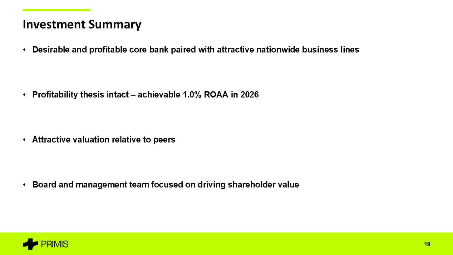 Per Share Results (1) Core Bank results based on management reporting excluding business lines and with estimated corporate allocations and Income statement Items are stated in thousands (2) Data from Capital IQ with pricing as of January 27,2026 (3) Peers based on FRST proxy compensation peer group 18 Increasing Tangible book Value Per Share (1) Significant Upside Just to Peer Group Average (3) • 2026 estimates are achievable and lead to attractive ROE • 27% upside to the peer group average valuation of 1.31x $13.34 $11.71 $11.48 $11.40 $10.42 Q4'25 Q3'25 Q2'25 Q1'25 Q4'24 0.46 1.01 1.06 1.08 1.09 1.20 1.26 1.28 1.31 1.51 1.56 1.75 2.67 BCBP MNSB FRST CFFI FRBA MVBF BRBS JMSB CARE MPB CCNE SFST PFIS BWFG SHBI HTB CBAN SMBK ACNB ORRF MCBS CCBG FCBC CHCO Price / Tangible Book (2) 7.1 7.8 7.8 7.9 8.0 8.4 8.8 9.0 9.1 9.2 9.2 9.6 9.6 9.8 11.0 11.1 11.3 11.9 12.1 12.5 13.6 14.1 CARE BCBP CCNE FRST PFIS ORRF CBAN MCBS FRBA BWFG MPB SHBI ACNB MNSB SFST SMBK JMSB FCBC HTB CCBG CHCO MVBF Price/ 2026 Earnings Per Share (2)