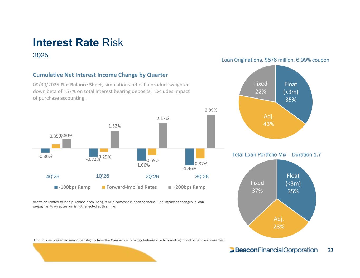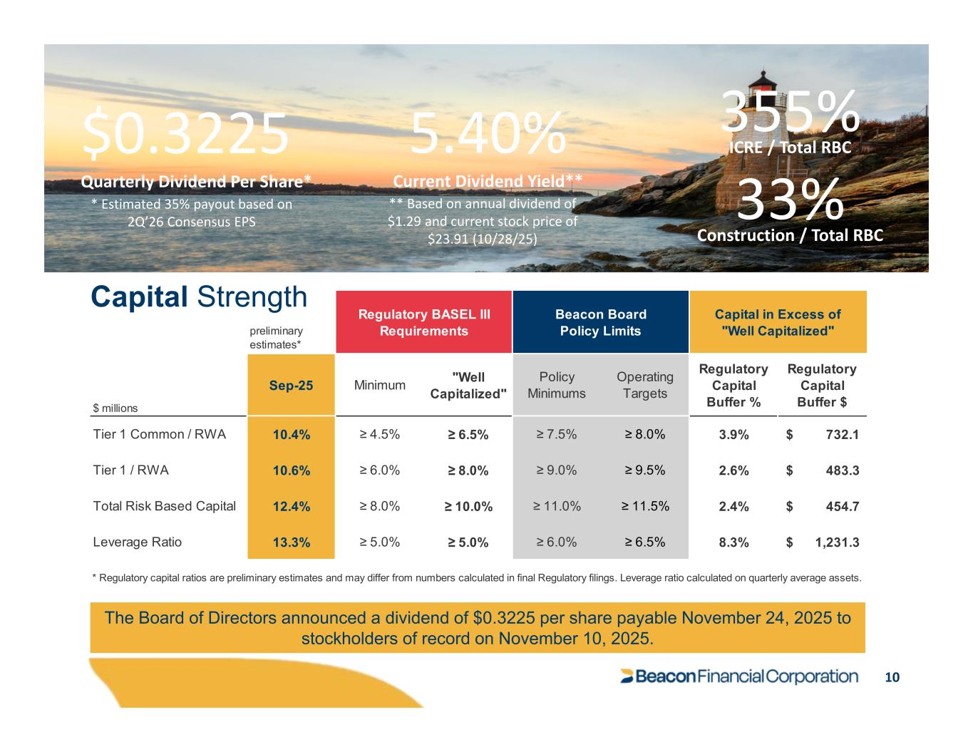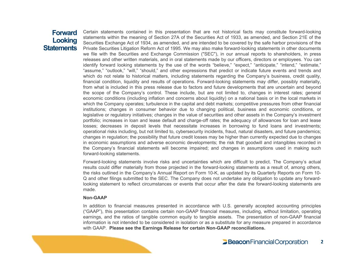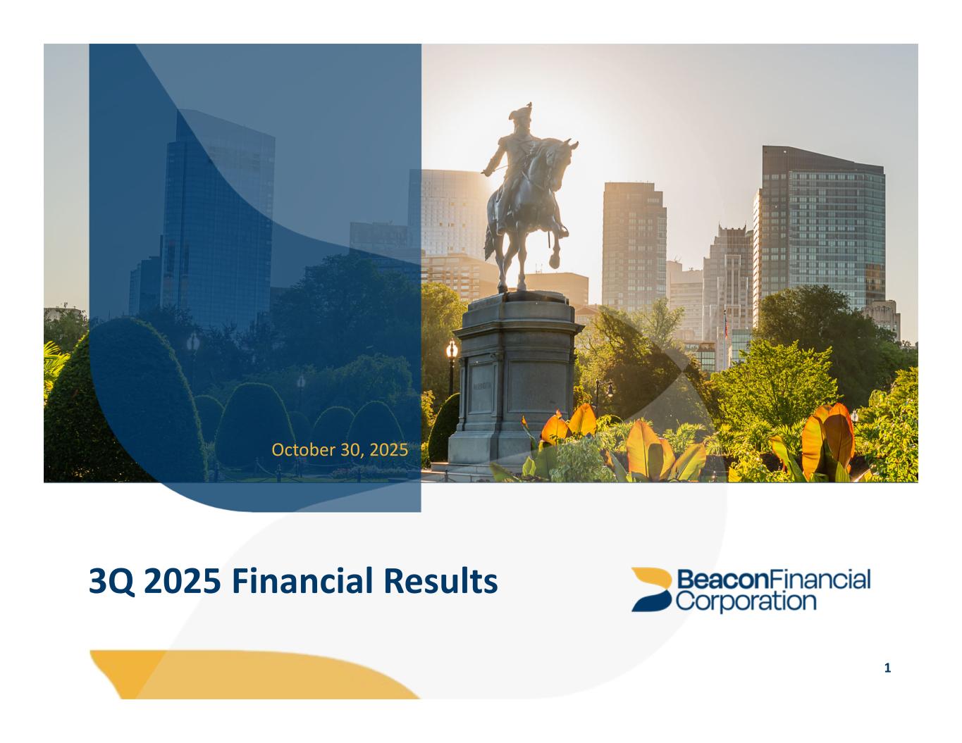 当社は2025年10月30日(木)午後1時30分(米国東部時間)よりカンファレンス・コール/ウェブキャストを実施し、当四半期の業績、事業ハイライト、見通しについて説明する。決算説明資料は当社ウェブサイト(beaconfinancialcorporation.com)でご覧いただけます。通話をお聞きになり、当社の決算説明資料をご覧になりたい方は、https://events.q4inc.com/attendee/309414724。スライドをご覧にならずに通話をお聞きになりたい方は、800-715-9871(米国)または646-307-1963(国際電話)にダイヤルし、ビーコン・フィナンシャル・コーポレーションのカンファレンス・コール(アクセスコード6567963)とお申し出ください。電話会議の録音再生は、電話会議後1週間、当社ウェブサイトの「投資家向け情報」または800-770-2030(米国およびカナダ)または609-800-9909(国際電話)にダイヤルし、パスコードを入力することで利用できる:6567963.