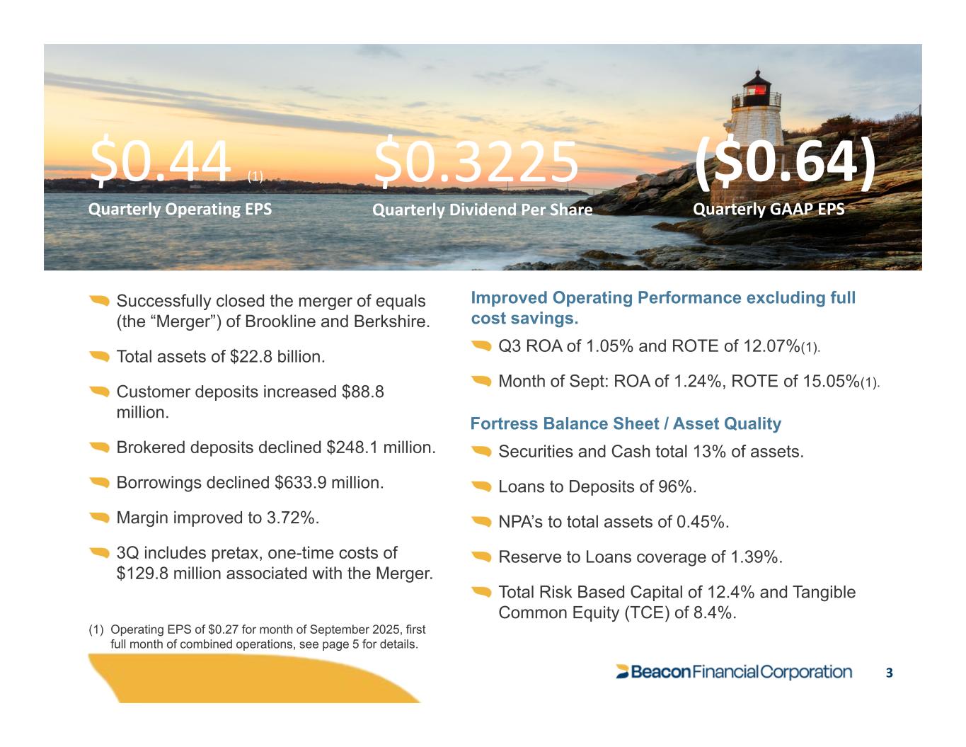 ビーコン・ファイナンシャル・コーポレーション、バークシャー・ヒルズ・バンコープとブルックライン・バンコープの対等合併に伴う一時的費用を反映した第3四半期業績を発表。
