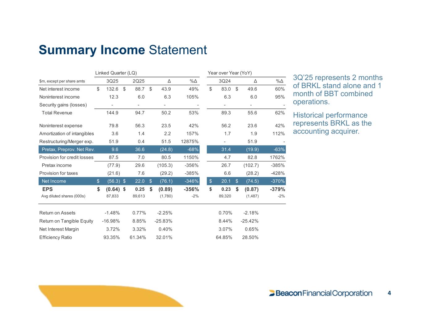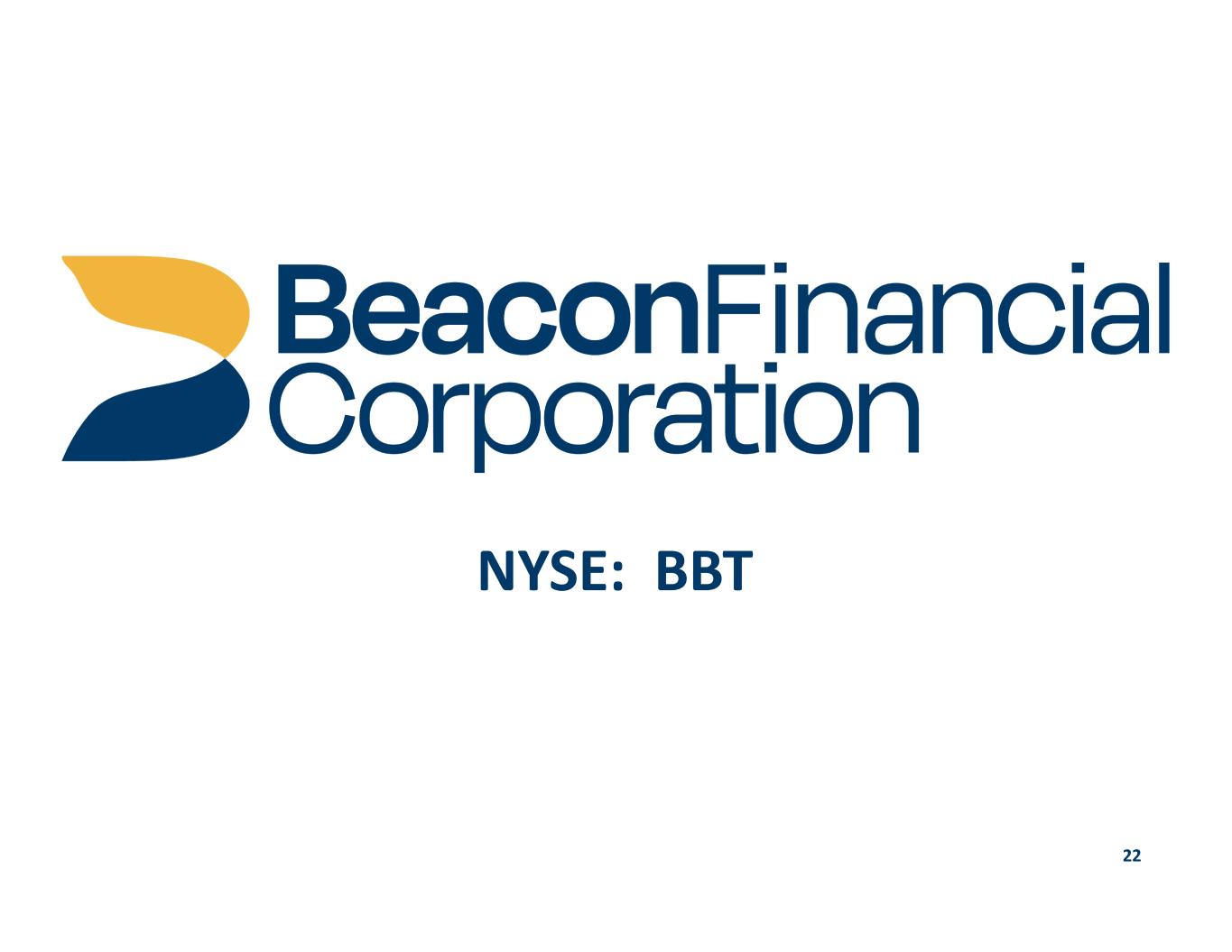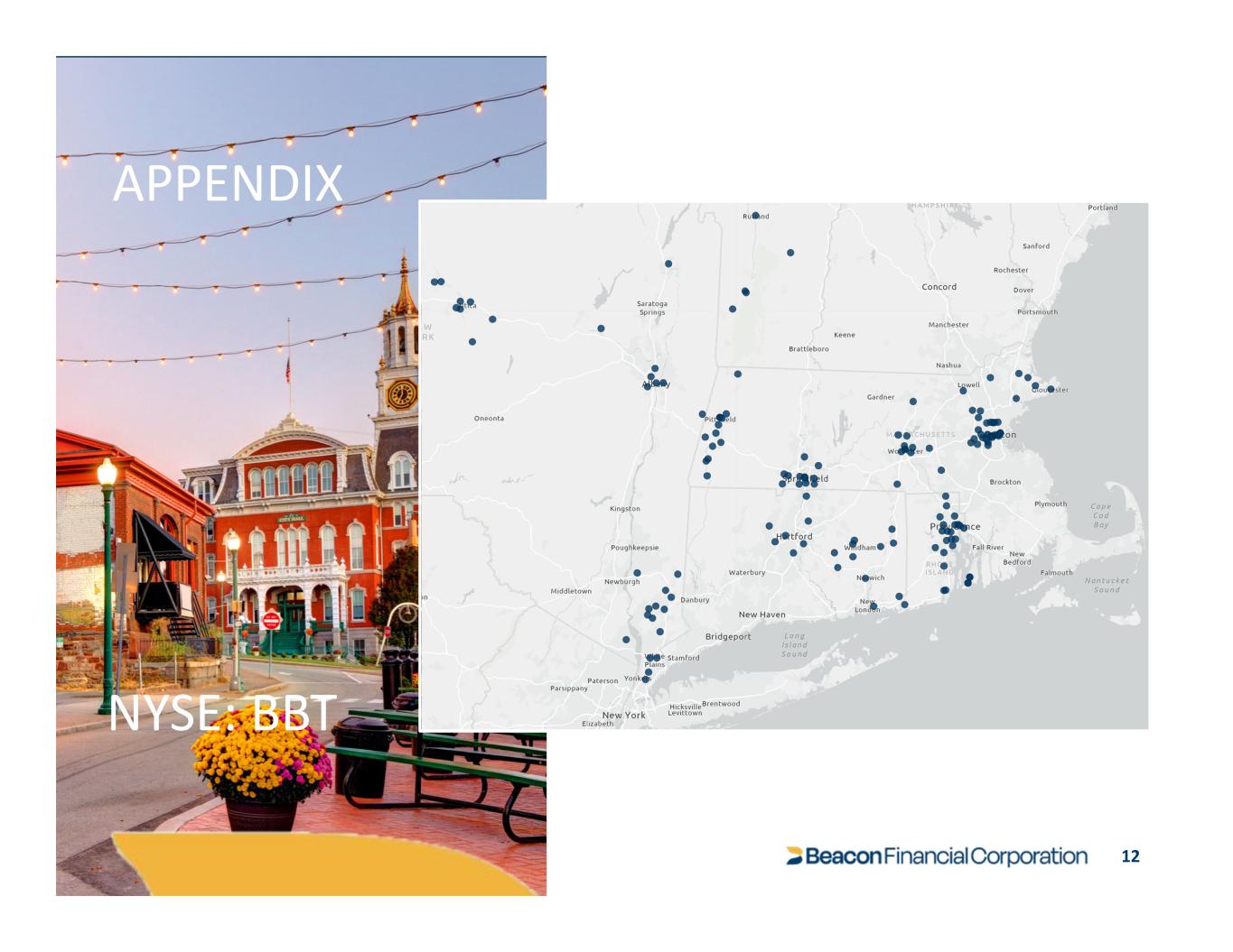 ビーコン・ファイナンシャル・コーポレーション(NYSE: BBT)はビーコン・バンク&トラスト(通称ビーコンバンク)の持株会社で、2025年9月1日にバークシャー・ヒルズ・バンコープとブルックライン・バンコープの対等合併により誕生した北東部を営業基盤とするフルサービスの地方銀行である。ボストンに本社を置き、総資産は228億ドル、ニューイングランドとニューヨークに145以上の支店を持つ。ビーコン・バンクは、商業、キャッシュ・マネジメント、アセット・ベース・レンディング、リテール、コンシューマー、住宅向け商品・サービスなど、あらゆるニーズに対応したバンキング・ソリューションを提供している。バークシャー・バンク、ブルックライン・バンク、バンクRI、PCSBバンクの各銀行部門を通じて事業を展開している。また、イースタン・ファンディングの子会社を通じて設備資金調達、44 ビジネス・キャピタル部門を通じてSBA融資、クラレンドン・プライベートを通じてプライベート・ウェルス・サービスも提供している。