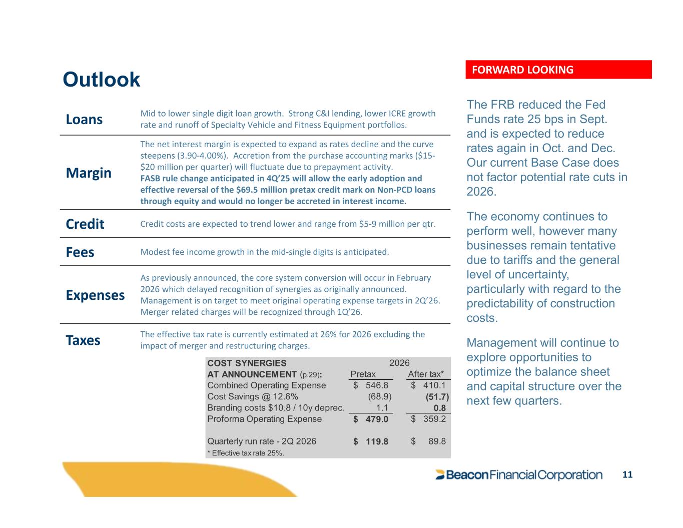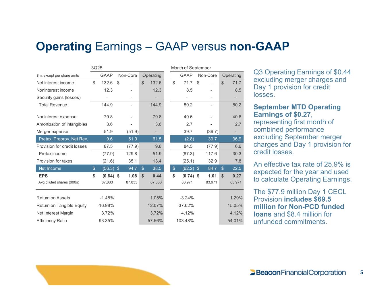 2025年度第3四半期の業績には、本合併に関連した税引前一時費用1億2980万ドルが反映されています。これらの一時費用を除いた2025年度第3四半期の営業利益(非GAAP基準)は3,850万ドル(希薄化後1株当たり0.44ドル)でした。これらの一時的費用の内訳は、合併関連費用5,190万ドルおよび同じく合併に関連した貸倒引当金繰入額7,790万ドルです。当期純利益と営業利益の調整については、後述の「非 GAAP 財務情報」をご参照ください。
