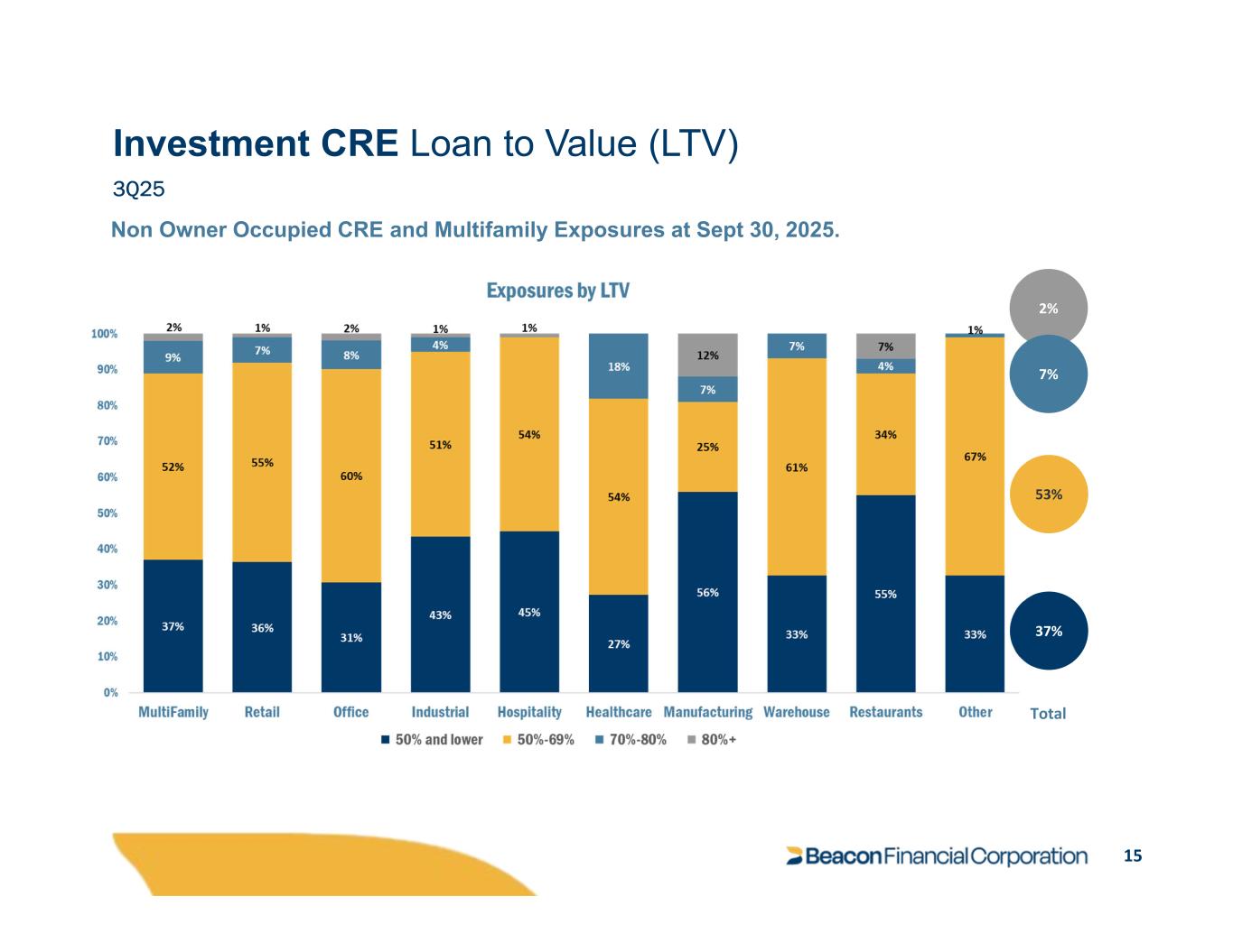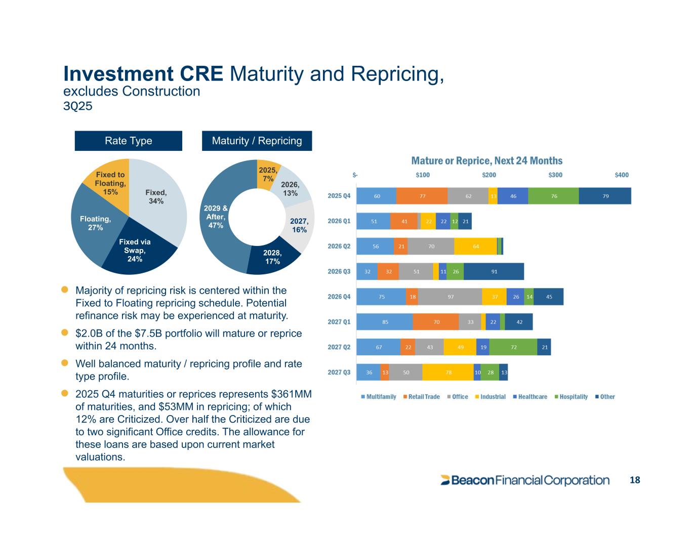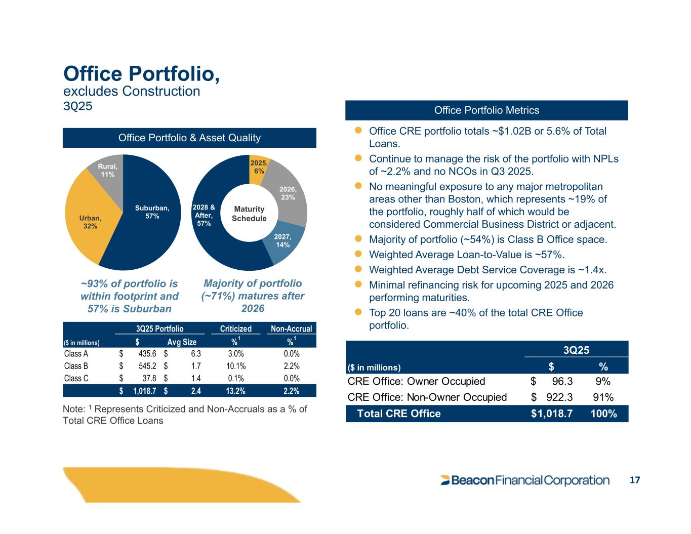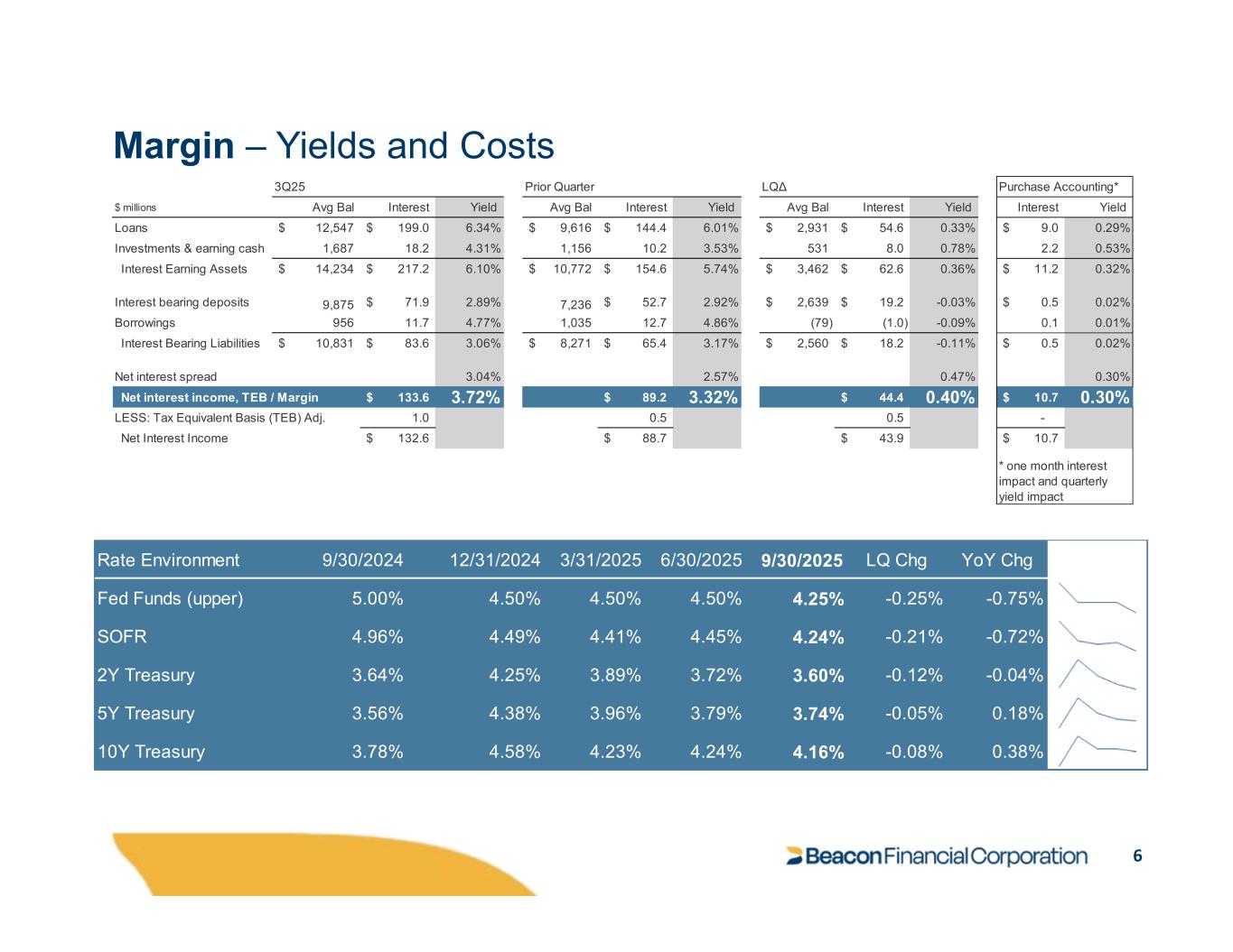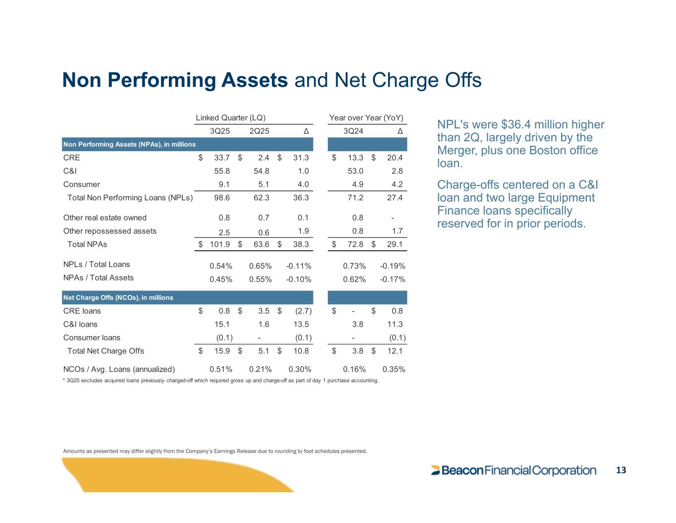 貸倒引当金繰入額は、2025 年 6 月 30 日に終了した四半期が 700 万ドルであったのに対し、2025 年 9 月 30 日に終了した四半期は 8,750 万ドルを計上しました。引当金の増加は、合併に関連したパーチェス法による会計処理 7,790 万ドルを反映したもので、その内訳は、資金調達したローンに対するもの 6,950 万ドル、資金調達していないコミットメントに対するもの 840 万ドルです。合併に関連した会計上の調整を除くと、引当金は960万ドルで、前四半期から260万ドル増加しました。この増加は、ボストンのオフィス部門における継続的なストレスと、イースタン・ファン ディングの大型設備ファイナンス・クレジット1件に対する特別引当金の追加計上を反映したものです。