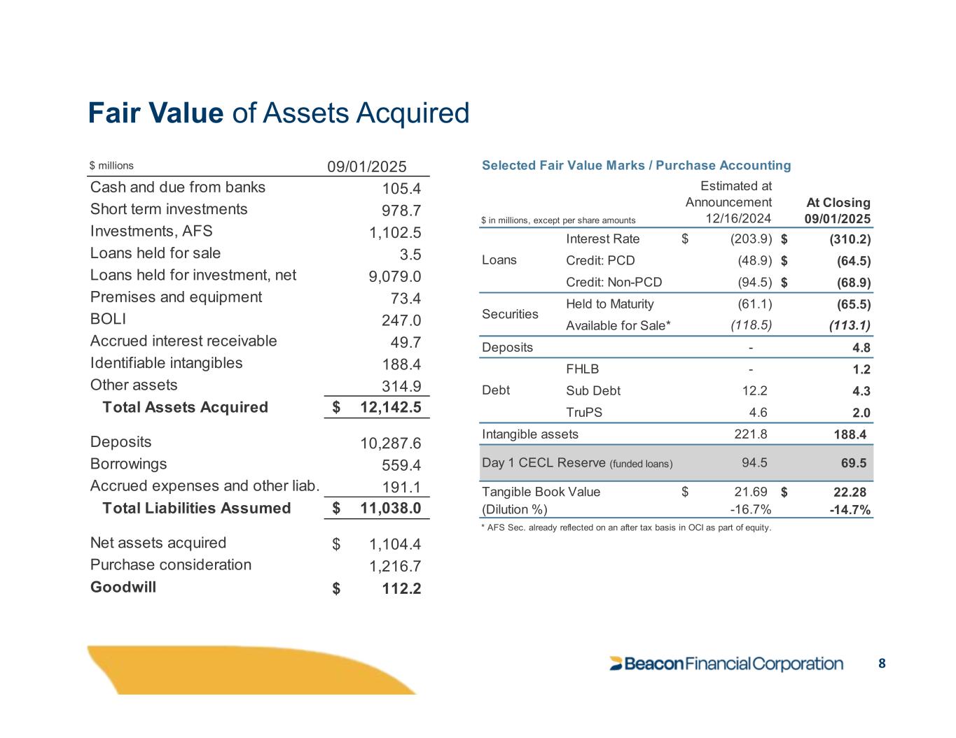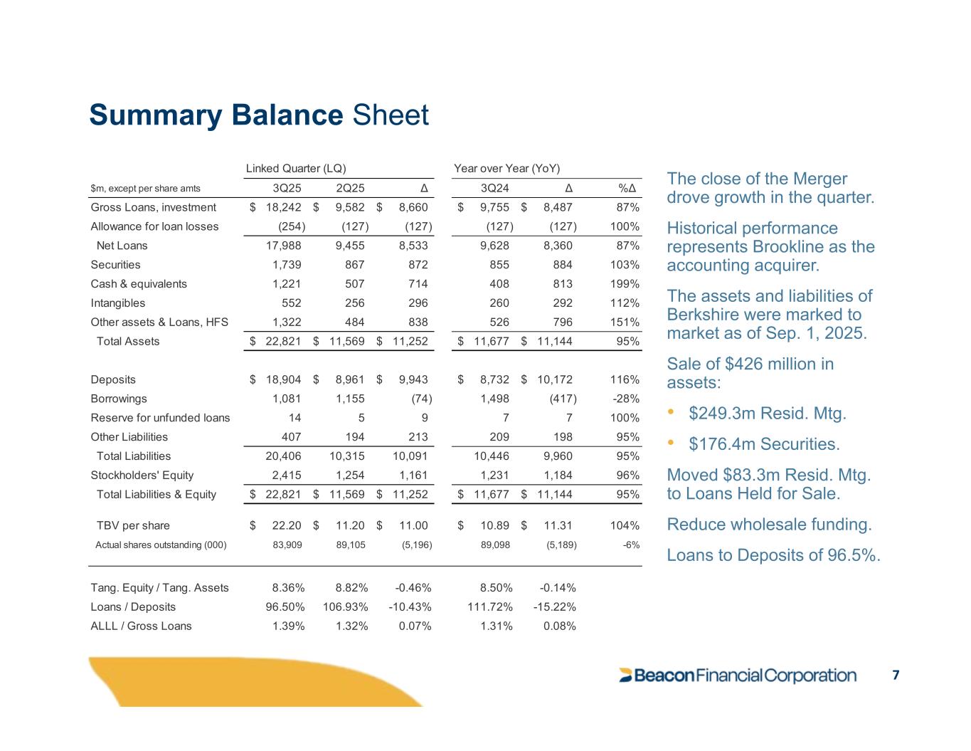 本合併は取得法による逆取得として会計処理され、財務報告上はBerkshireが法的取得者、Brooklineが会計的取得者として扱われた。当社は2025年9月1日現在、バークシャーの資産および負債をそれぞれの公正価値で計上した。本合併時、バークシャーは公正価値によるパーチェス法による調整後で、約121億ドルの資産、91億ドルの貸出金、11億ドルの投資有価証券、103億ドルの預金を拠出した。