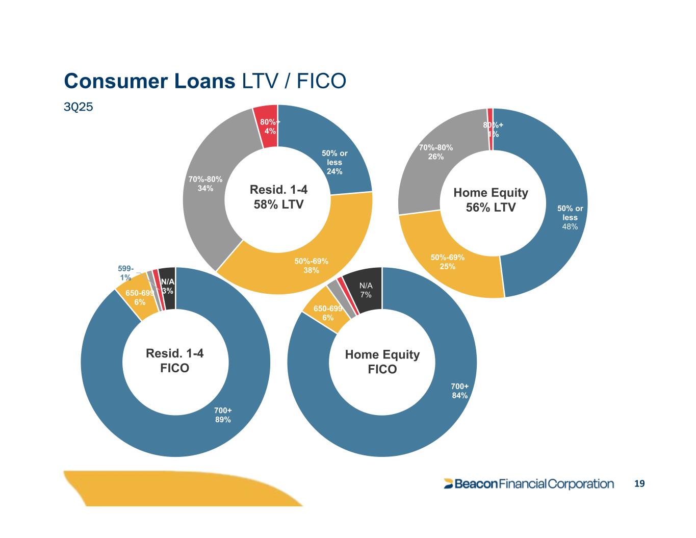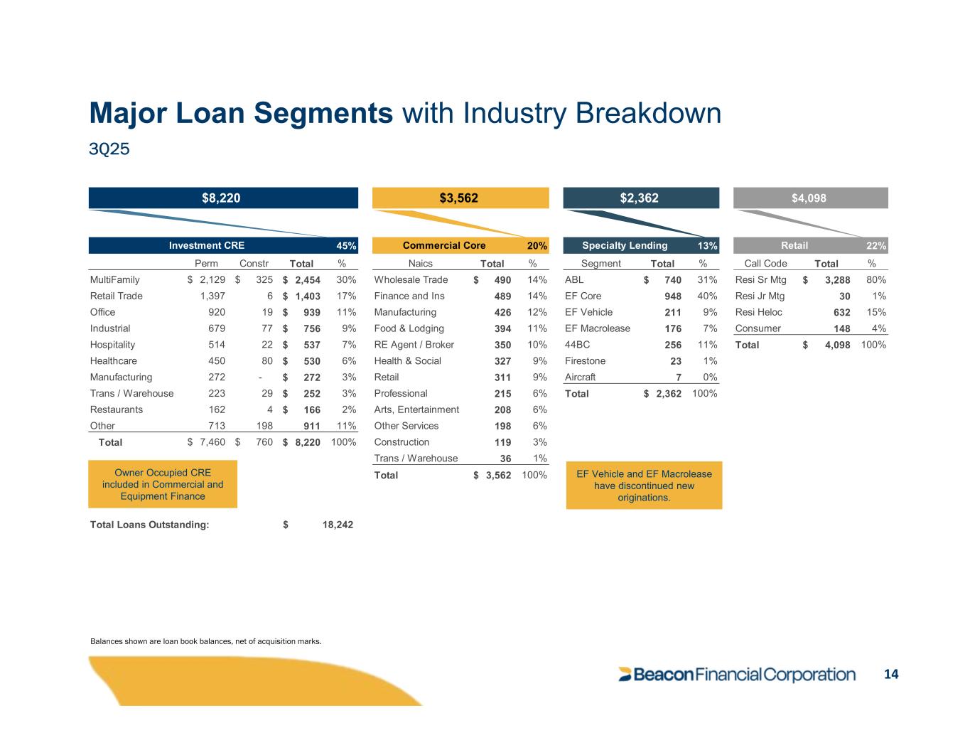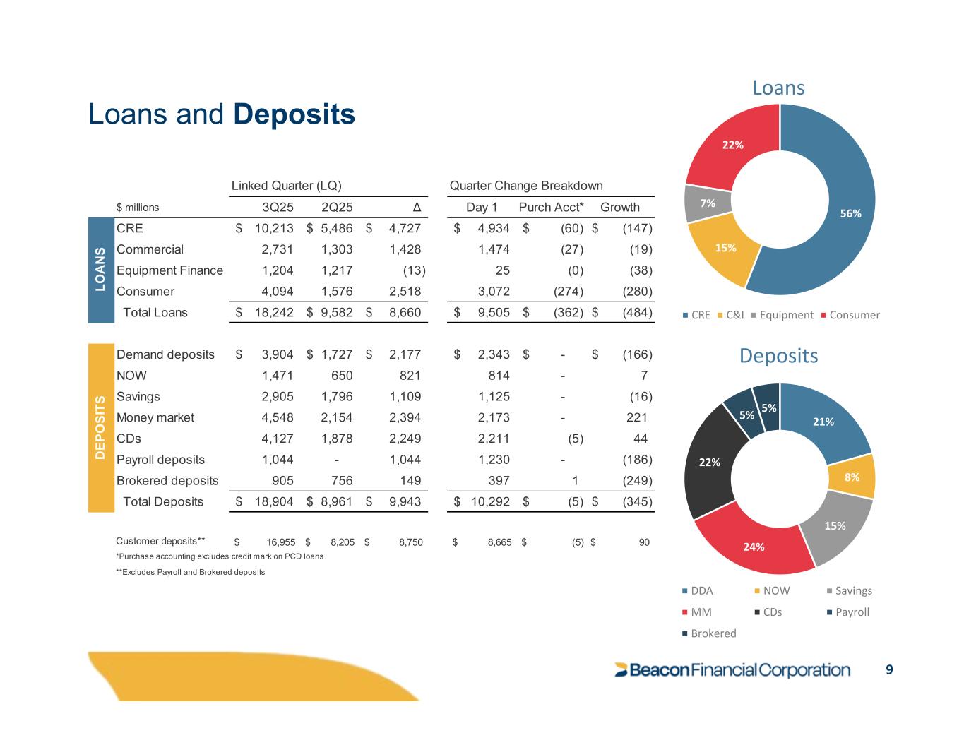 2025年9月30日現在のローン・リース総額は182億ドルであった。本合併により91億ドルのローン・リースが引き継がれた。合併の影響を除くと、ローン・リースは2025年6月30日から4億1,940万ドル減少し、2024年9月30日 からは5億9,230万ドル減少しました。この減少は主に、購入したモーゲージ・ローン2億4,930万ドルの売却と、購入したモーゲージ・ローン8,330万ドルの 売却目的保有への追加移管によるもので、これらの売却は第4四半期中に完了する予定です。
