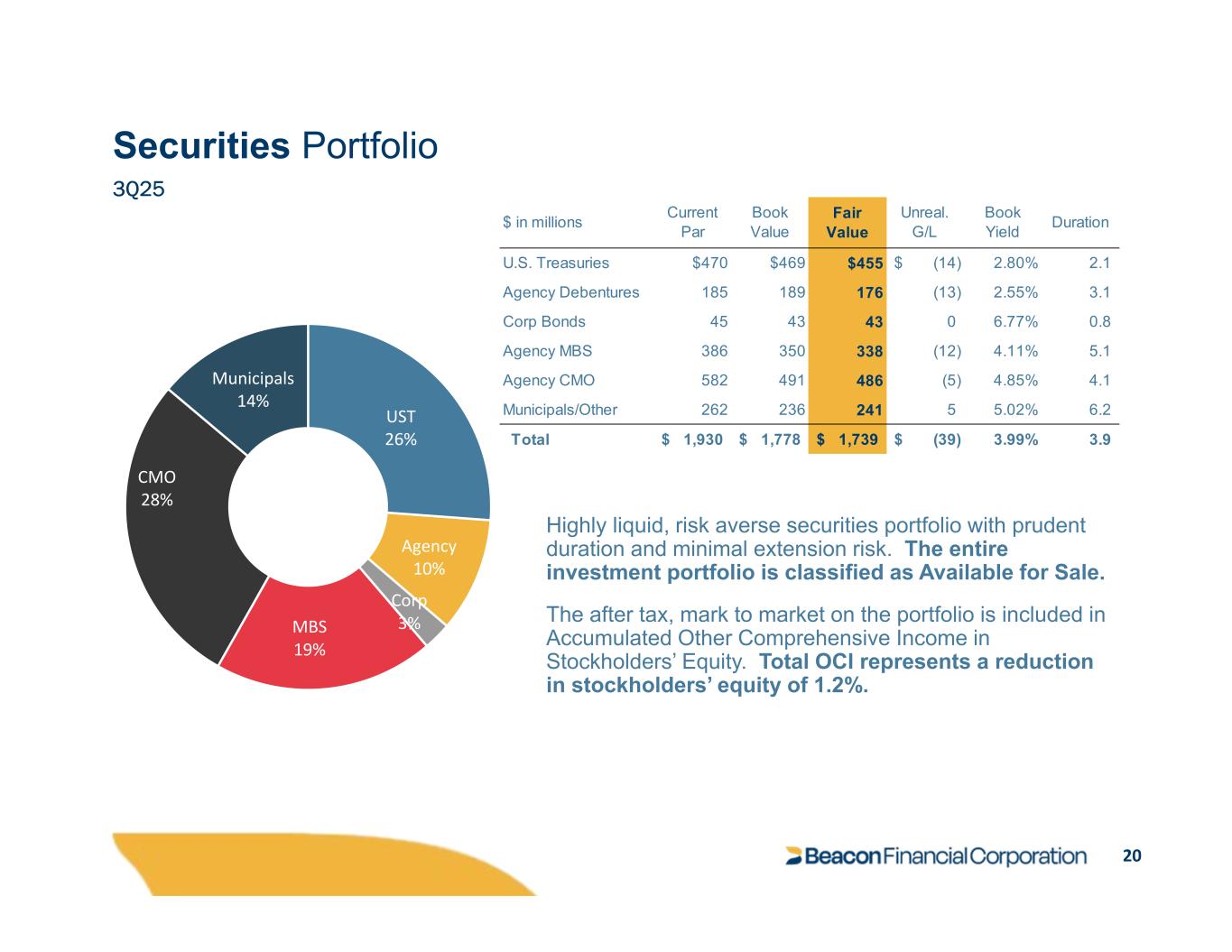 2025年9月30日現在の投資有価証券総額は、合併の影響を除くと、2025年6月30日時点から2億2970万ドル減少して17億ドルとなり、2024年9月30日時点から2億1840万ドル減少した。当社は本合併において11億ドルの投資有価証券を引き受けました。第 3 四半期中、合併後のバランスシートの金利リスクを調整し、ホールセール資金調達を削減するた め、レガシー・バークシャーの投資ポートフォリオのうち 1.7640 万ドルを売却しました。