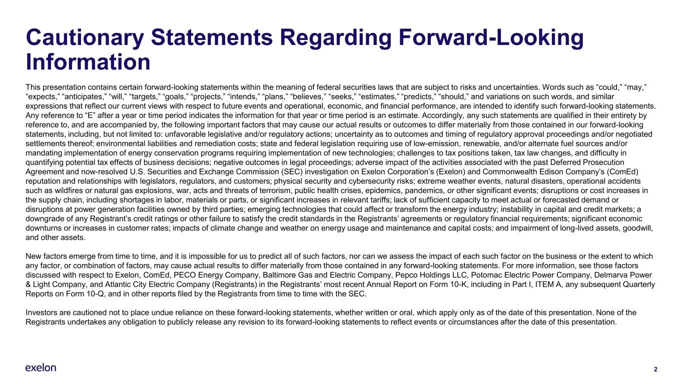 従って、このような記述はすべて、当社の実際の結果や成果が当社の将来の見通しに関する記述に含まれるものとは大きく異なる原因となり得る以下の重要な要因を参照することにより、その全体が限定され、またそれに付随するものです(ただし、これらに限定されるものではありません):不利な立法措置および/または規制措置、規制当局による承認手続きおよび/または交渉による和解の結果および時期の不確実性、環境負債および修復費用、低排出ガス、再生可能燃料および/または代替燃料の使用を義務付ける州法および連邦法、および/または新技術の導入を義務付ける省エネルギープログラムの実施義務付け;税務ポジションに対する異議申し立て、税法の変更、経営判断の潜在的な税効果を定量化することの困難さ、法的手続きにおける否定的な結果、過去の起訴猶予合意および現在解決済みの SEC 調査に関連する活動が Exelon Corporation および Commonwealth Edison Company の評判および議員、規制当局、顧客との関係に及ぼす悪影響、物理的セキュリティおよびサイバーセキュリティリスク;異常気象、自然災害、山火事や天然ガス爆発などの操業上の事故、戦争、テロ行為とその脅威、公衆衛生危機、伝染病、パンデミック、またはその他の重大な出来事、労働力、材料、部品の不足を含むサプライチェーンにおける混乱やコスト上昇、または関連する関税の大幅な上昇、実際の需要または予測される需要を満たすのに十分な容量の不足、または第三者が所有する発電施設における混乱;エネルギー業界に影響を及ぼしまたは変革する可能性のある新技術、資本市場および信用市場の不安定性、登録者の信用格付けの引き下げ、または登録者の契約もしくは規制上の財務要件における信用基準を満たさないその他の不履行、大幅な景気後退または顧客料金の上昇、気候変動および天候がエネルギー使用量および保守・資本コストに及ぼす影響、長期性資産、営業権およびその他の資産の減損。