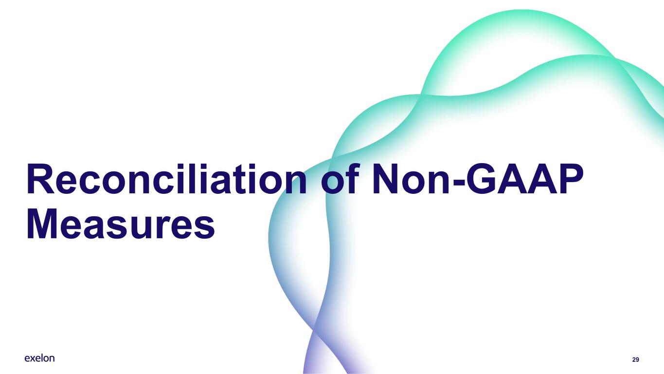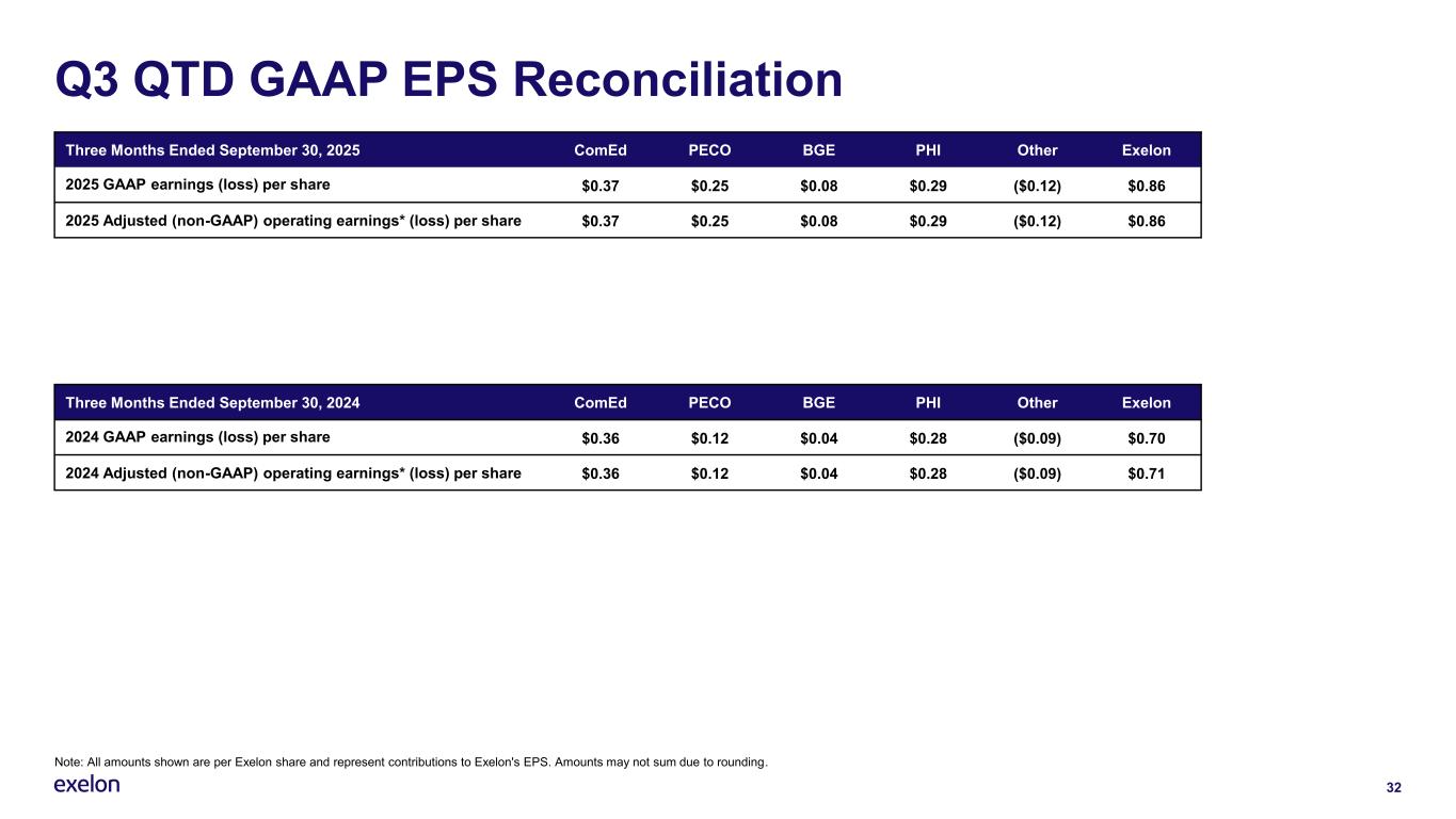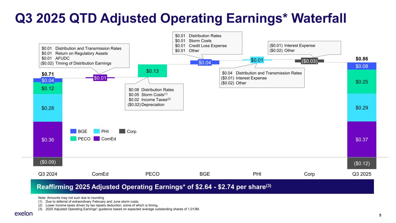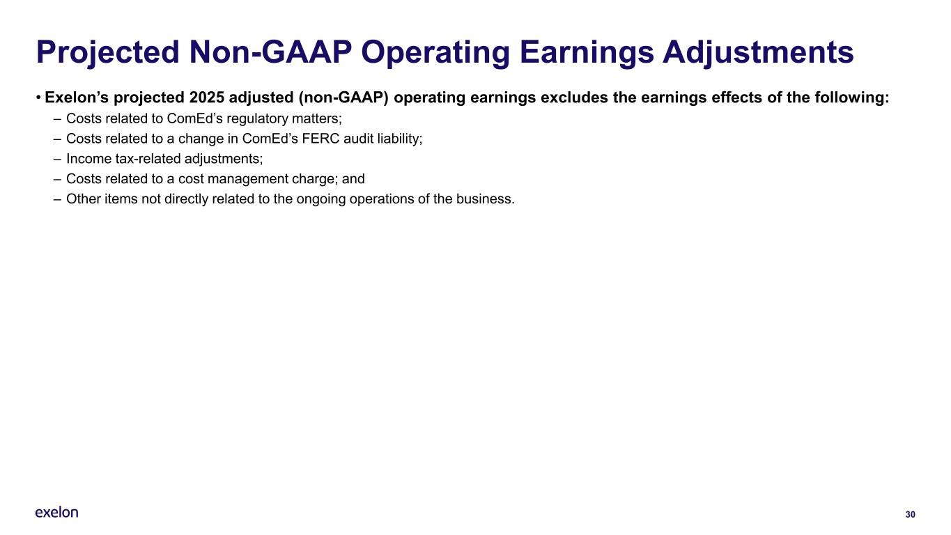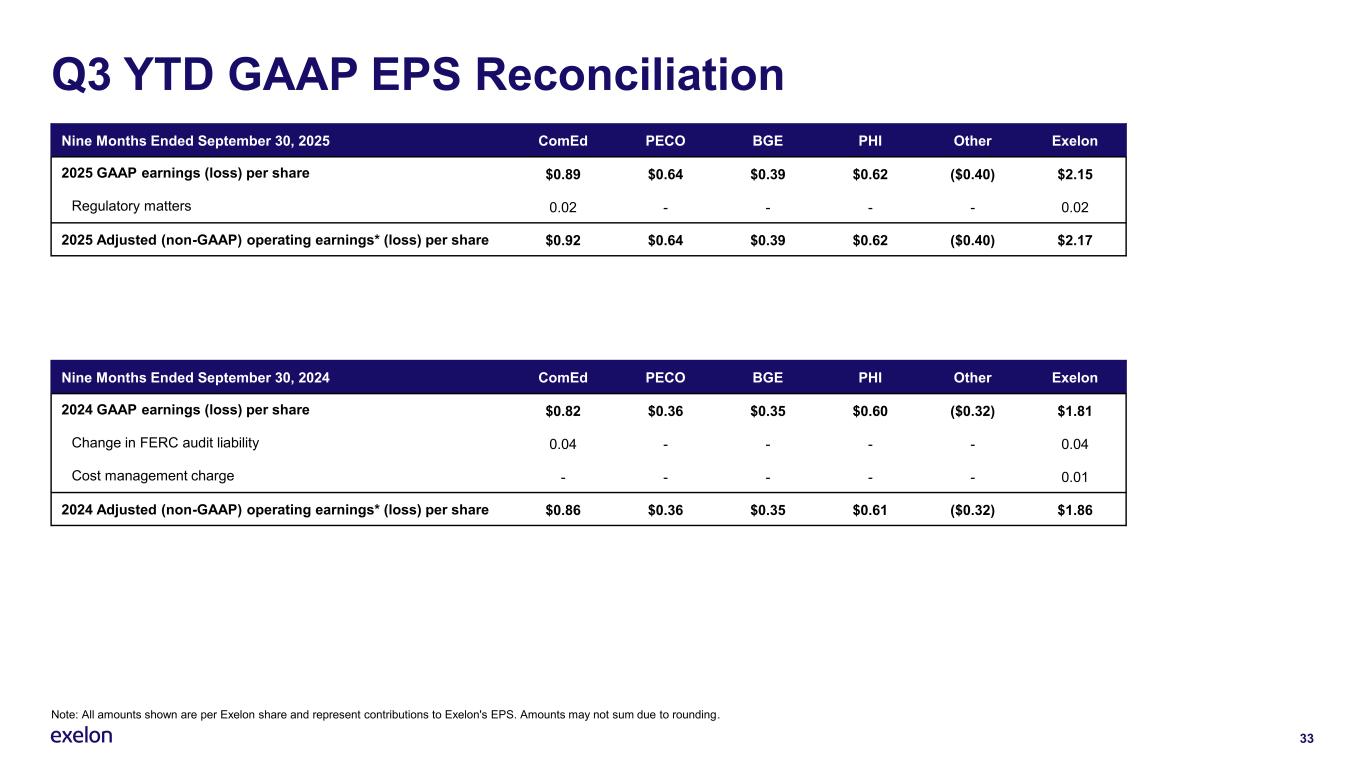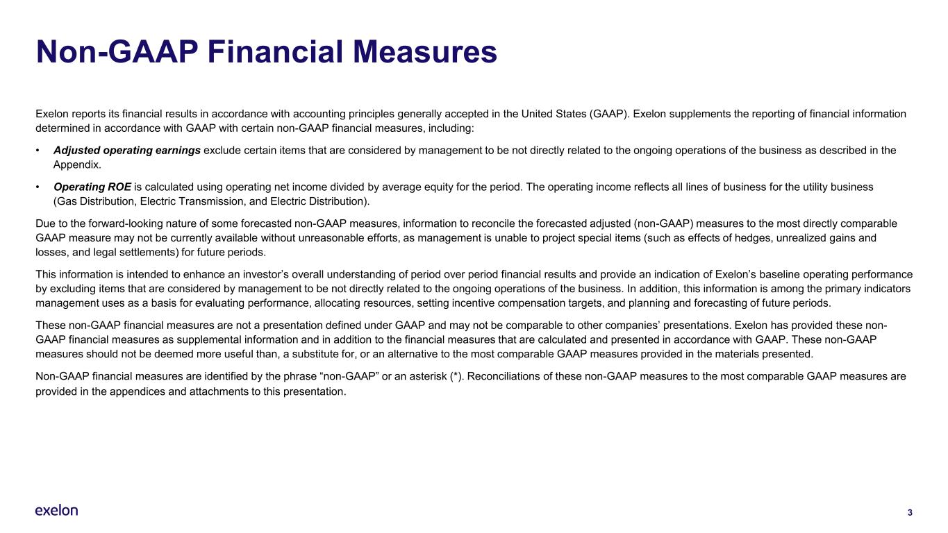 エクセロンの2025年第3四半期のGAAPベースの純利益は、2024年第3四半期の1株当たり0.70ドルから0.86ドルに増加した。2025年第3四半期の調整後(非GAAP基準)営業利益は、2024年第3四半期の1株当たり0.71ドルから0.86ドルに増加しました。GAAPベースの純利益と調整後(非GAAPベース)営業利益の調整については、4ページ以降の表を参照。