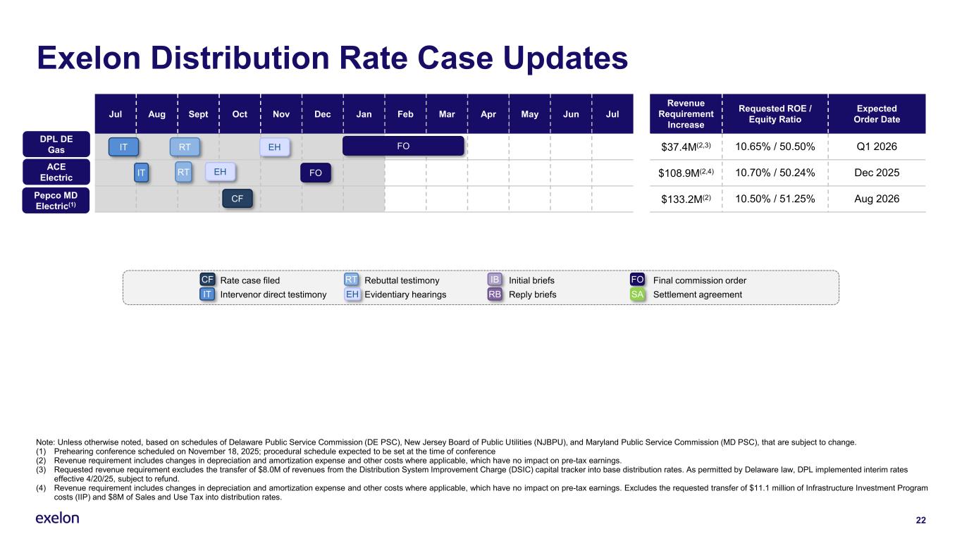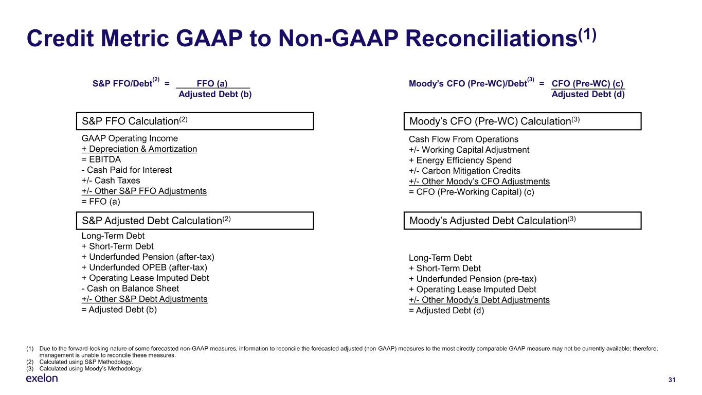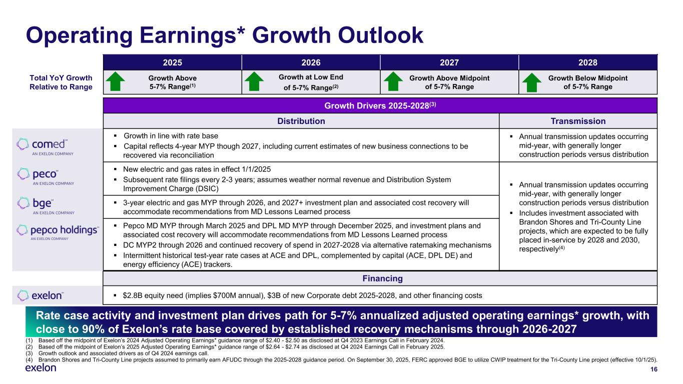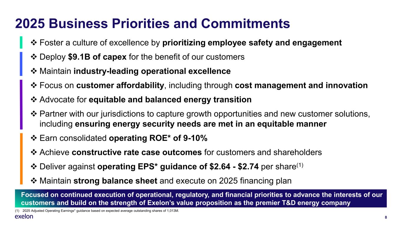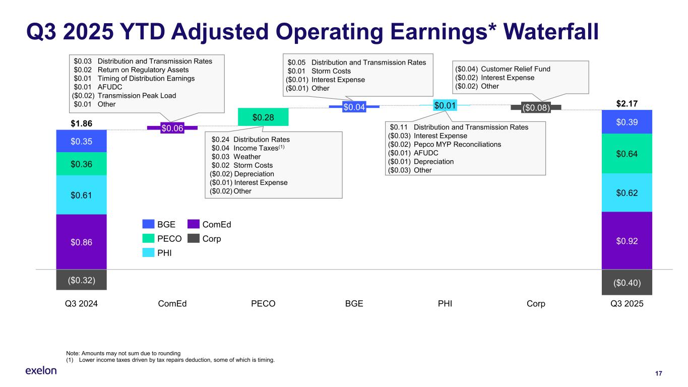 エクセロンの2025年第3四半期のGAAPベースの純利益は、2024年第3四半期の1株当たり0.70ドルから0.86ドルに増加した。2025年第3四半期の調整後(非GAAP基準)営業利益は、2024年第3四半期の1株当たり0.71ドルから0.86ドルに増加しました。GAAPベースの純利益と調整後(非GAAPベース)営業利益の調整については、4ページ以降の表を参照。