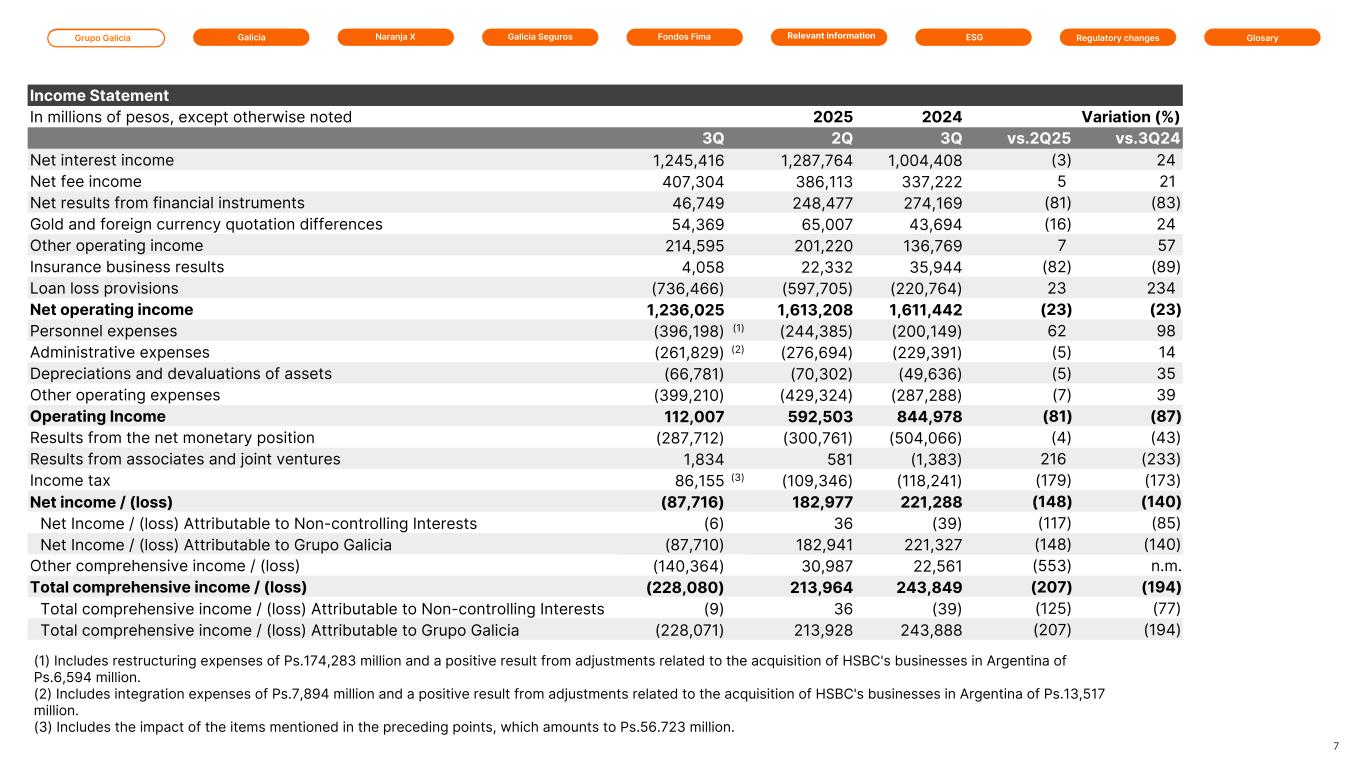 Grupo Galicia Galicia Naranja X Galicia Seguros GlosaryRelevant information ESG Regulatory changesFondos Fima Income Statement In millions of pesos, except otherwise noted 2025 2025 2024 Variation (%) 3Q 2Q 3Q vs.2Q25 vs.3Q24 Net interest income 1,245,416 1,287,764 1,004,408 (3) 24 Net fee income 407,304 386,113 337,222 5 21 Net results from financial instruments 46,749 248,477 274,169 (81) (83) Gold and foreign currency quotation differences 54,369 65,007 43,694 (16) 24 Other operating income 214,595 201,220 136,769 7 57 Insurance business results 4,058 22,332 35,944 (82) (89) Loan loss provisions (736,466) (597,705) (220,764) 23 234 Net operating income 1,236,025 1,613,208 1,611,442 (23) (23) Personnel expenses (396,198) (1) (244,385) (200,149) 62 98 Administrative expenses (261,829) (2) (276,694) (229,391) (5) 14 Depreciations and devaluations of assets (66,781) (70,302) (49,636) (5) 35 Other operating expenses (399,210) (429,324) (287,288) (7) 39 Operating Income 112,007 592,503 844,978 (81) (87) Results from the net monetary position (287,712) (300,761) (504,066) (4) (43) Results from associates and joint ventures 1,834 581 (1,383) 216 (233) Income tax 86,155 (3) (109,346) (118,241) (179) (173) Net income / (loss) (87,716) 182,977 221,288 (148) (140) Net Income / (loss) Attributable to Non-controlling Interests (6) 36 (39) (117) (85) Net Income / (loss) Attributable to Grupo Galicia (87,710) 182,941 221,327 (148) (140) Other comprehensive income / (loss) (140,364) 30,987 22,561 (553) n.m. Total comprehensive income / (loss) (228,080) 213,964 243,849 (207) (194) Total comprehensive income / (loss) Attributable to Non-controlling Interests (9) 36 (39) (125) (77) Total comprehensive income / (loss) Attributable to Grupo Galicia (228,071) 213,928 243,888 (207) (194) 7 (1) Includes restructuring expenses of Ps.174,283 million and a positive result from adjustments related to the acquisition of HSBC's businesses in Argentina of Ps.6,594 million. (2) Includes integration expenses of Ps.7,894 million and a positive result from adjustments related to the acquisition of HSBC's businesses in Argentina of Ps.13,517 million. (3) Includes the impact of the items mentioned in the preceding points, which amounts to Ps.56.723 million.