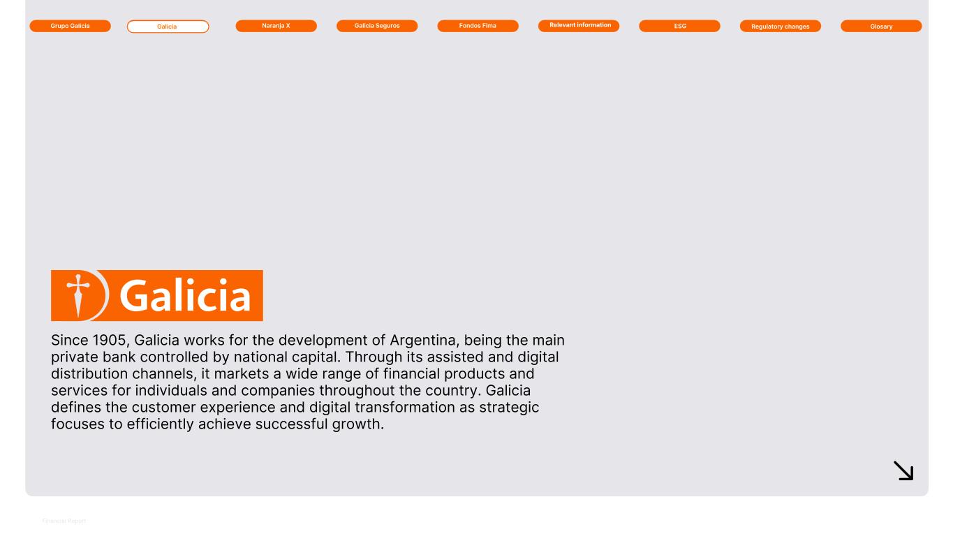 Grupo Galicia Galicia Naranja X Galicia Seguros GlosaryRelevant information ESG Regulatory changesFondos Fima Ps.32,219 million Net income 9M25 period -97% vs. 9M 2024 Portfolio Quality 5.8% +140 bp. vs. 3Q 2024 Coverage 101.5% -1,640 bp. vs. 3Q 2024 ROE 0.7% -2,700 bp vs. 9M 2024 Efficiency 60.5% +2,590 bp vs. 9M 2024 10 Ps.(103,893) million Net income for the quarter -194% vs. 3Q 2024 ROE (7.3%) -1,660 bp vs. 3Q 2024 Efficiency 75.3% +2,380 bp vs. 3Q 2024 Cost of risk 3Q 9.3% +110 bp. vs. 3Q 2024 Cost of risk 9M 8.2% +60 bp. vs. 9M 2024 Capital Ratio 22.1% -430 bp. vs. 3Q 2024 14.8% Market share: Loans to the private sector 16.4% Market share: Deposits to the private sector +290 bp vs. 3Q 2024 +640 bp vs. 3Q 2024 Highlights Branches Deposit accounts In thousands Employees Credit Cards In thousands 332 11,825 6,398 5,301 Digital clients 93% To facilitate comparability, the information corresponding to second quarter of 2025 has been adjusted. The information corresponding to third quarter of 2024 does not include the balances of Galicia Más. ROE without integrations expenses 3.4%(1) ROE without integrations expenses (0.2%)(1) (1) ROE without integration expenses: excludes integration expenses (IT, voluntary retirement plans and adjustments to the result for the acquisition of HSBC's businesses in Argentina recorded in the 2024 fiscal year) net of income tax.