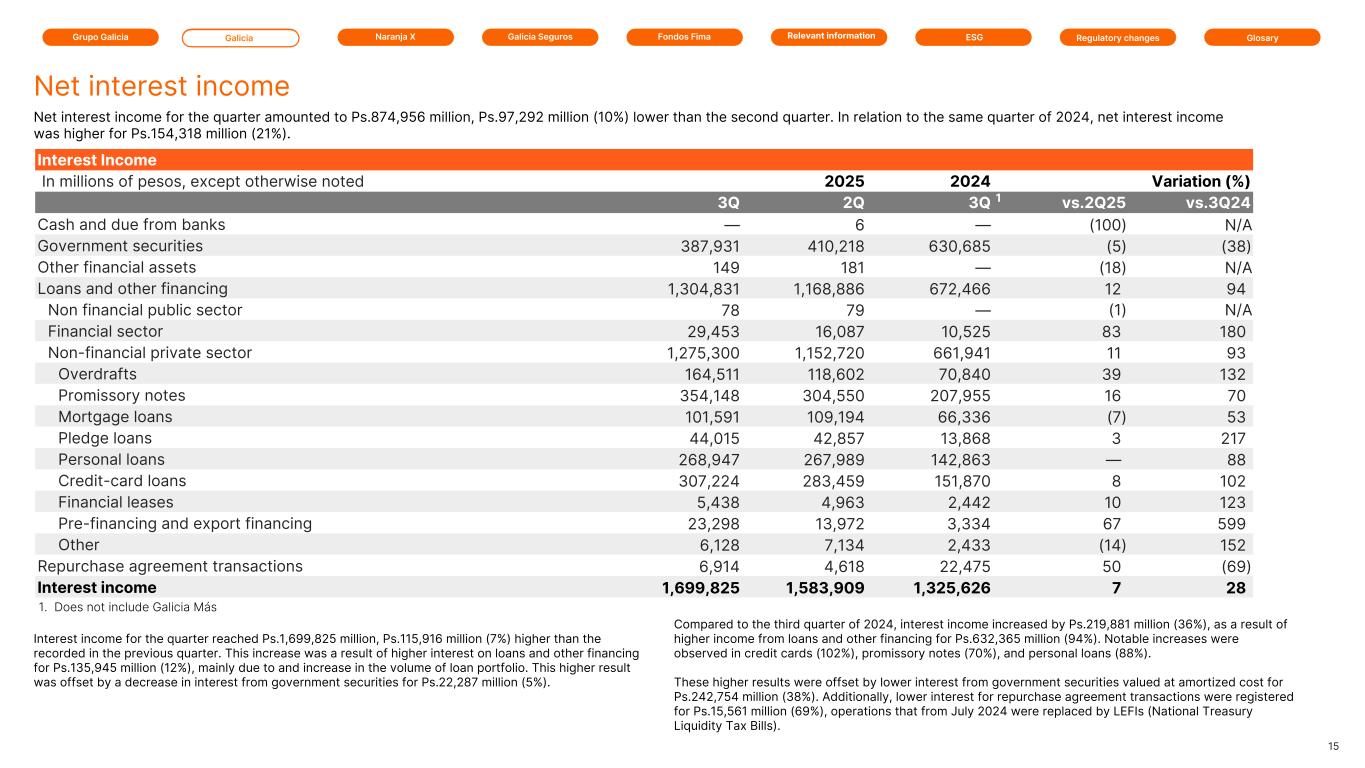 Grupo Galicia Galicia Naranja X Galicia Seguros GlosaryRelevant information ESG Regulatory changesFondos Fima Interest Income In millions of pesos, except otherwise noted 2025 2025 2024 Variation (%) 3Q 2Q 3Q 1 vs.2Q25 vs.3Q24 Cash and due from banks — 6 — (100) N/A Government securities 387,931 410,218 630,685 (5) (38) Other financial assets 149 181 — (18) N/A Loans and other financing 1,304,831 1,168,886 672,466 12 94 Non financial public sector 78 79 — (1) N/A Financial sector 29,453 16,087 10,525 83 180 Non-financial private sector 1,275,300 1,152,720 661,941 11 93 Overdrafts 164,511 118,602 70,840 39 132 Promissory notes 354,148 304,550 207,955 16 70 Mortgage loans 101,591 109,194 66,336 (7) 53 Pledge loans 44,015 42,857 13,868 3 217 Personal loans 268,947 267,989 142,863 — 88 Credit-card loans 307,224 283,459 151,870 8 102 Financial leases 5,438 4,963 2,442 10 123 Pre-financing and export financing 23,298 13,972 3,334 67 599 Other 6,128 7,134 2,433 (14) 152 Repurchase agreement transactions 6,914 4,618 22,475 50 (69) Interest income 1,699,825 1,583,909 1,325,626 7 28 Net interest income Net interest income for the quarter amounted to Ps.874,956 million, Ps.97,292 million (10%) lower than the second quarter. In relation to the same quarter of 2024, net interest income was higher for Ps.154,318 million (21%). 15 1. Does not include Galicia Más Interest income for the quarter reached Ps.1,699,825 million, Ps.115,916 million (7%) higher than the recorded in the previous quarter. This increase was a result of higher interest on loans and other financing for Ps.135,945 million (12%), mainly due to and increase in the volume of loan portfolio. This higher result was offset by a decrease in interest from government securities for Ps.22,287 million (5%). Compared to the third quarter of 2024, interest income increased by Ps.219,881 million (36%), as a result of higher income from loans and other financing for Ps.632,365 million (94%). Notable increases were observed in credit cards (102%), promissory notes (70%), and personal loans (88%). These higher results were offset by lower interest from government securities valued at amortized cost for Ps.242,754 million (38%). Additionally, lower interest for repurchase agreement transactions were registered for Ps.15,561 million (69%), operations that from July 2024 were replaced by LEFIs (National Treasury Liquidity Tax Bills).