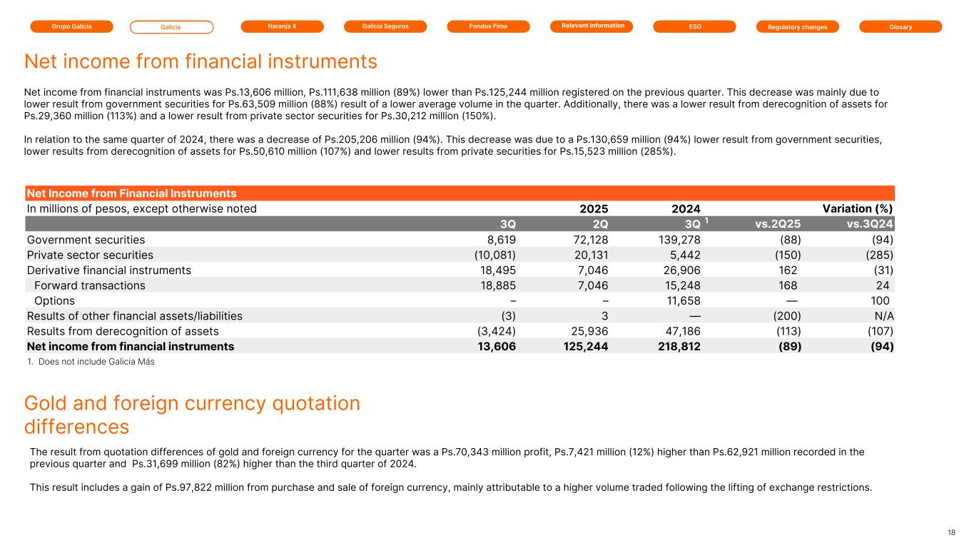 Grupo Galicia Galicia Naranja X Galicia Seguros GlosaryRelevant information ESG Regulatory changesFondos Fima Net Fee Income In millions of pesos, except otherwise noted 2025 2025 2024 Variation (%) 3Q 2Q 3Q 1 vs.2Q25 vs.3Q24 Credit cards 113,363 107,018 81,391 6 39 Deposit accounts 46,639 39,191 34,517 19 35 Insurance 4,125 11,310 6,344 (64) (35) Financial fees 102 503 315 (80) (68) Credit- related fees 1,062 2,277 1,875 (53) (43) Foreign trade 15,152 13,968 11,605 8 31 Collections 21,378 22,072 19,965 (3) 7 Utility-Bills collection services 20,116 18,356 15,312 10 31 Mutual Funds 8,439 8,541 7,184 (1) 17 Fees from bundles of products 34,079 34,048 23,398 — 46 Other 32,344 25,207 28,238 28 15 Total fee income 296,799 282,491 230,144 5 29 Total expenditures (48,156) (54,204) (42,515) (11) 13 Net fee income 248,643 228,287 187,629 9 33 The net fee income reached Ps.248,643 million, registering an increase of Ps.20,356 million (9%) compared to the second quarter of 2025. This increase was due to higher fee from deposit accounts for Ps.7,448 million (19%) and higher fees from credit cards for Ps.6,345 million (6%). Meanwhile, fee expenses registered an increase for Ps.6,048 million (11%). In relation to the third quarter of 2024, net fee income registered an increase for Ps.61,014 million (33%). This increase was primarily due to higher credit card fees of Ps.31,972 million (39%), higher deposit fees for Ps.12,122 million (35%) and an increase in fees from bundle of products for Ps.10,681 million (46%), offset by an increase in fee expenses of Ps.5,641 million (13%). 17 Net fee income 1. Does not include Galicia Más