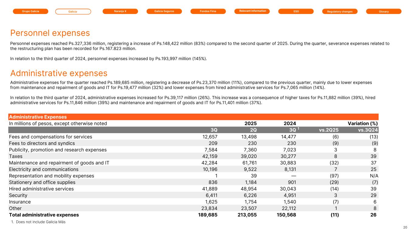 Grupo Galicia Galicia Naranja X Galicia Seguros GlosaryRelevant information ESG Regulatory changesFondos Fima Administrative Expenses In millions of pesos, except otherwise noted 2025 2025 2024 Variation (%) 3Q 2Q 3Q 1 vs.2Q25 vs.3Q24 Fees and compensations for services 12,657 13,498 14,477 (6) (13) Fees to directors and syndics 209 230 230 (9) (9) Publicity, promotion and research expenses 7,584 7,360 7,023 3 8 Taxes 42,159 39,020 30,277 8 39 Maintenance and repairment of goods and IT 42,284 61,761 30,883 (32) 37 Electricity and communications 10,196 9,522 8,131 7 25 Representation and mobility expenses 1 39 — (97) N/A Stationery and office supplies 836 1,184 901 (29) (7) Hired administrative services 41,889 48,954 30,043 (14) 39 Security 6,411 6,226 4,951 3 29 Insurance 1,625 1,754 1,540 (7) 6 Other 23,834 23,507 22,112 1 8 Total administrative expenses 189,685 213,055 150,568 (11) 26 Administrative expenses for the quarter reached Ps.189,685 million, registering a decrease of Ps.23,370 million (11%), compared to the previous quarter, mainly due to lower expenses from maintenance and repairment of goods and IT for Ps.19,477 million (32%) and lower expenses from hired administrative services for Ps.7,065 million (14%). In relation to the third quarter of 2024, administrative expenses increased for Ps.39,117 million (26%). This increase was a consequence of higher taxes for Ps.11,882 million (39%), hired administrative services for Ps.11,846 million (39%) and maintenance and repairment of goods and IT for Ps.11,401 million (37%). Personnel expenses reached Ps.327,336 million, registering a increase of Ps.148,422 million (83%) compared to the second quarter of 2025. During the quarter, severance expenses related to the restructuring plan has been recorded for Ps.167.823 million. In relation to the third quarter of 2024, personnel expenses increased by Ps.193,997 million (145%). 20 Administrative expenses Personnel expenses 1. Does not include Galicia Más