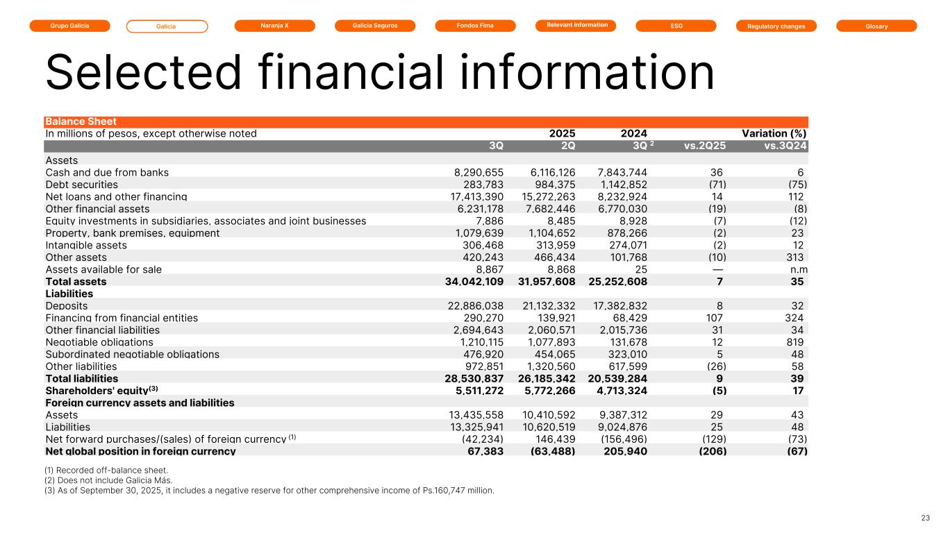 Grupo Galicia Galicia Naranja X Galicia Seguros GlosaryRelevant information ESG Regulatory changesFondos Fima Balance Sheet In millions of pesos, except otherwise noted 2025 2025 2024 Variation (%) 3Q 2Q 3Q 2 vs.2Q25 vs.3Q24 Assets Cash and due from banks 8,290,655 6,116,126 7,843,744 36 6 Debt securities 283,783 984,375 1,142,852 (71) (75) Net loans and other financing 17,413,390 15,272,263 8,232,924 14 112 Other financial assets 6,231,178 7,682,446 6,770,030 (19) (8) Equity investments in subsidiaries, associates and joint businesses 7,886 8,485 8,928 (7) (12) Property, bank premises, equipment 1,079,639 1,104,652 878,266 (2) 23 Intangible assets 306,468 313,959 274,071 (2) 12 Other assets 420,243 466,434 101,768 (10) 313 Assets available for sale 8,867 8,868 25 — n.m Total assets 34,042,109 31,957,608 25,252,608 7 35 Liabilities Deposits 22,886,038 21,132,332 17,382,832 8 32 Financing from financial entities 290,270 139,921 68,429 107 324 Other financial liabilities 2,694,643 2,060,571 2,015,736 31 34 Negotiable obligations 1,210,115 1,077,893 131,678 12 819 Subordinated negotiable obligations 476,920 454,065 323,010 5 48 Other liabilities 972,851 1,320,560 617,599 (26) 58 Total liabilities 28,530,837 26,185,342 20,539,284 9 39 Shareholders' equity(3) 5,511,272 5,772,266 4,713,324 (5) 17 Foreign currency assets and liabilities Assets 13,435,558 10,410,592 9,387,312 29 43 Liabilities 13,325,941 10,620,519 9,024,876 25 48 Net forward purchases/(sales) of foreign currency (1) (42,234) 146,439 (156,496) (129) (73) Net global position in foreign currency 67,383 (63,488) 205,940 (206) (67) (1) Recorded off-balance sheet. (2) Does not include Galicia Más. (3) As of September 30, 2025, it includes a negative reserve for other comprehensive income of Ps.160,747 million. 23 Selected financial information