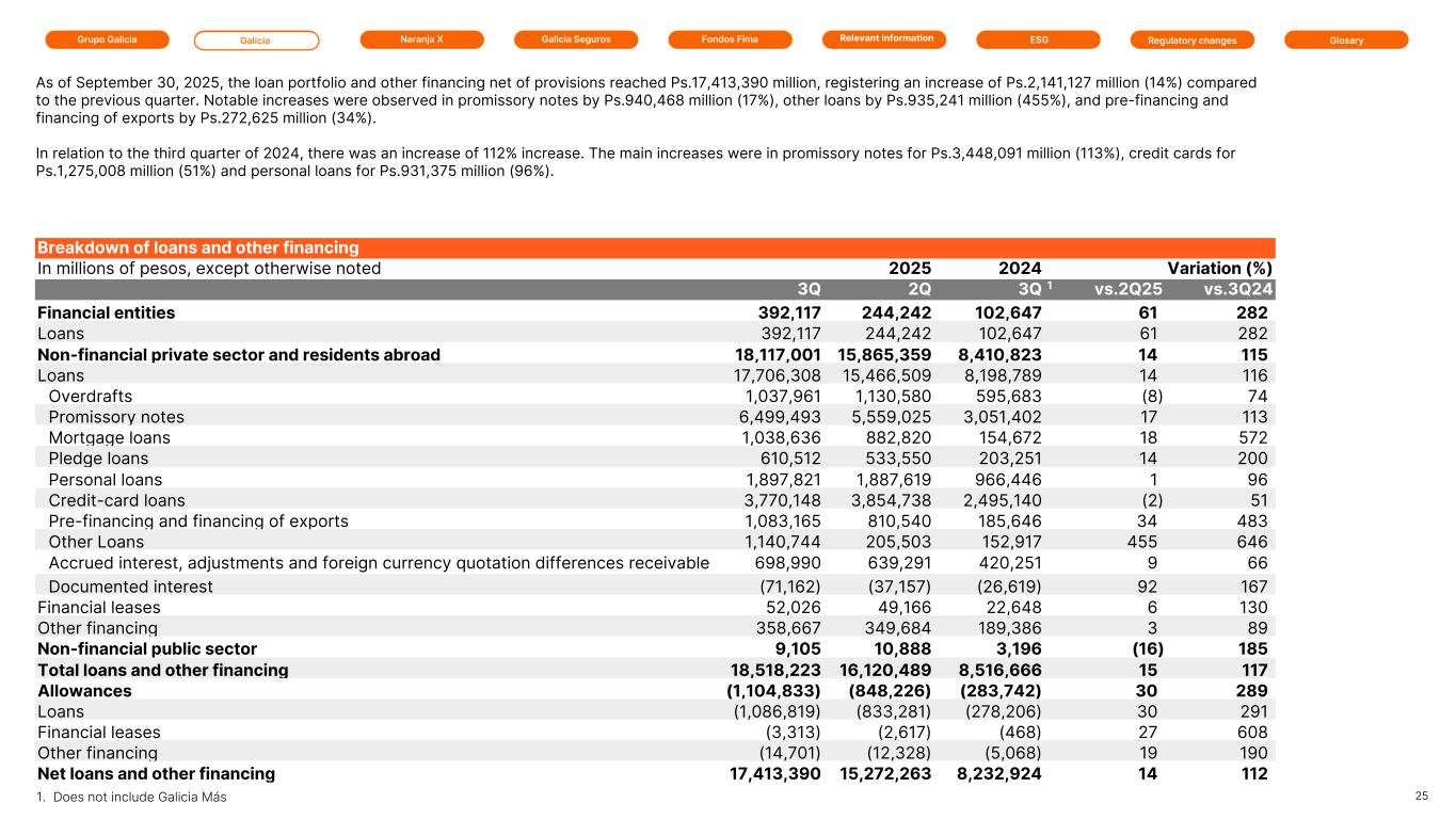 Grupo Galicia Galicia Naranja X Galicia Seguros GlosaryRelevant information ESG Regulatory changesFondos Fima Breakdown of loans and other financing In millions of pesos, except otherwise noted 2025 2025 2024 Variation (%) 3Q 2Q 3Q 1 vs.2Q25 vs.3Q24 Financial entities 392,117 244,242 102,647 61 282 Loans 392,117 244,242 102,647 61 282 Non-financial private sector and residents abroad 18,117,001 15,865,359 8,410,823 14 115 Loans 17,706,308 15,466,509 8,198,789 14 116 Overdrafts 1,037,961 1,130,580 595,683 (8) 74 Promissory notes 6,499,493 5,559,025 3,051,402 17 113 Mortgage loans 1,038,636 882,820 154,672 18 572 Pledge loans 610,512 533,550 203,251 14 200 Personal loans 1,897,821 1,887,619 966,446 1 96 Credit-card loans 3,770,148 3,854,738 2,495,140 (2) 51 Pre-financing and financing of exports 1,083,165 810,540 185,646 34 483 Other Loans 1,140,744 205,503 152,917 455 646 Accrued interest, adjustments and foreign currency quotation differences receivable 698,990 639,291 420,251 9 66 Documented interest (71,162) (37,157) (26,619) 92 167 Financial leases 52,026 49,166 22,648 6 130 Other financing 358,667 349,684 189,386 3 89 Non-financial public sector 9,105 10,888 3,196 (16) 185 Total loans and other financing 18,518,223 16,120,489 8,516,666 15 117 Allowances (1,104,833) (848,226) (283,742) 30 289 Loans (1,086,819) (833,281) (278,206) 30 291 Financial leases (3,313) (2,617) (468) 27 608 Other financing (14,701) (12,328) (5,068) 19 190 Net loans and other financing 17,413,390 15,272,263 8,232,924 14 112 As of September 30, 2025, the loan portfolio and other financing net of provisions reached Ps.17,413,390 million, registering an increase of Ps.2,141,127 million (14%) compared to the previous quarter. Notable increases were observed in promissory notes by Ps.940,468 million (17%), other loans by Ps.935,241 million (455%), and pre-financing and financing of exports by Ps.272,625 million (34%). In relation to the third quarter of 2024, there was an increase of 112% increase. The main increases were in promissory notes for Ps.3,448,091 million (113%), credit cards for Ps.1,275,008 million (51%) and personal loans for Ps.931,375 million (96%). 251. Does not include Galicia Más