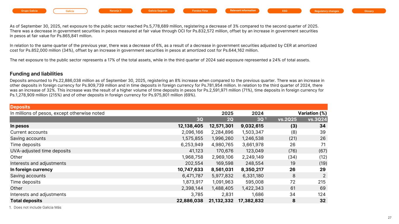 Grupo Galicia Galicia Naranja X Galicia Seguros GlosaryRelevant information ESG Regulatory changesFondos Fima Deposits In millions of pesos, except otherwise noted 2025 2025 2024 Variation (%) 3Q 2Q 3Q 1 vs.2Q25 vs.3Q24 In pesos 12,138,405 12,571,301 9,032,615 (3) 34 Current accounts 2,096,166 2,284,896 1,503,347 (8) 39 Saving accounts 1,575,855 1,996,260 1,246,538 (21) 26 Time deposits 6,253,949 4,980,765 3,661,978 26 71 UVA-adjusted time deposits 41,123 170,676 123,049 (76) (67) Other 1,968,758 2,969,106 2,249,149 (34) (12) Interests and adjustments 202,554 169,598 248,554 19 (19) In foreign currency 10,747,633 8,561,031 8,350,217 26 29 Saving accounts 6,471,787 5,977,832 6,331,180 8 2 Time deposits 1,873,917 1,091,963 595,008 72 215 Other 2,398,144 1,488,405 1,422,343 61 69 Interests and adjustments 3,785 2,831 1,686 34 124 Total deposits 22,886,038 21,132,332 17,382,832 8 32 Deposits amounted to Ps.22,886,038 million as of September 30, 2025, registering an 8% increase when compared to the previous quarter. There was an increase in other deposits in foreign currency for Ps.909,739 million and in time deposits in foreign currency for Ps.781,954 million. In relation to the third quarter of 2024, there was an increase of 32%. This increase was the result of a higher volume of time deposits in pesos for Ps.2,591,971 million (71%), time deposits in foreign currency for Ps.1,278,909 million (215%) and of other deposits in foreign currency for Ps.975,801 million (69%). As of September 30, 2025, net exposure to the public sector reached Ps.5,778,689 million, registering a decrease of 3% compared to the second quarter of 2025. There was a decrease in government securities in pesos measured at fair value through OCI for Ps.832,572 million, offset by an increase in government securities in pesos at fair value for Ps.865,841 million. In relation to the same quarter of the previous year, there was a decrease of 6%, as a result of a decrease in government securities adjusted by CER at amortized cost for Ps.852,000 million (34%), offset by an increase in government securities in pesos at amortized cost for Ps.644,162 million. The net exposure to the public sector represents a 17% of the total assets, while in the third quarter of 2024 said exposure represented a 24% of total assets. 27 Funding and liabilities 1. Does not include Galicia Más