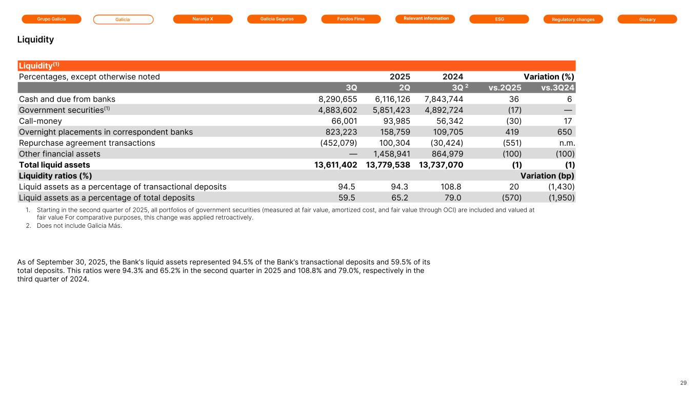 Grupo Galicia Galicia Naranja X Galicia Seguros GlosaryRelevant information ESG Regulatory changesFondos Fima Liquidity(1) Percentages, except otherwise noted 2025 2025 2024 Variation (%) 3Q 2Q 3Q 2 vs.2Q25 vs.3Q24 Cash and due from banks 8,290,655 6,116,126 7,843,744 36 6 Government securities(1) 4,883,602 5,851,423 4,892,724 (17) — Call-money 66,001 93,985 56,342 (30) 17 Overnight placements in correspondent banks 823,223 158,759 109,705 419 650 Repurchase agreement transactions (452,079) 100,304 (30,424) (551) n.m. Other financial assets — 1,458,941 864,979 (100) (100) Total liquid assets 13,611,402 13,779,538 13,737,070 (1) (1) Liquidity ratios (%) Variation (bp) Liquid assets as a percentage of transactional deposits 94.5 94.3 108.8 20 (1,430) Liquid assets as a percentage of total deposits 59.5 65.2 79.0 (570) (1,950) As of September 30, 2025, the Bank’s liquid assets represented 94.5% of the Bank’s transactional deposits and 59.5% of its total deposits. This ratios were 94.3% and 65.2% in the second quarter in 2025 and 108.8% and 79.0%, respectively in the third quarter of 2024. 29 Liquidity 1. Starting in the second quarter of 2025, all portfolios of government securities (measured at fair value, amortized cost, and fair value through OCI) are included and valued at fair value For comparative purposes, this change was applied retroactively. 2. Does not include Galicia Más.