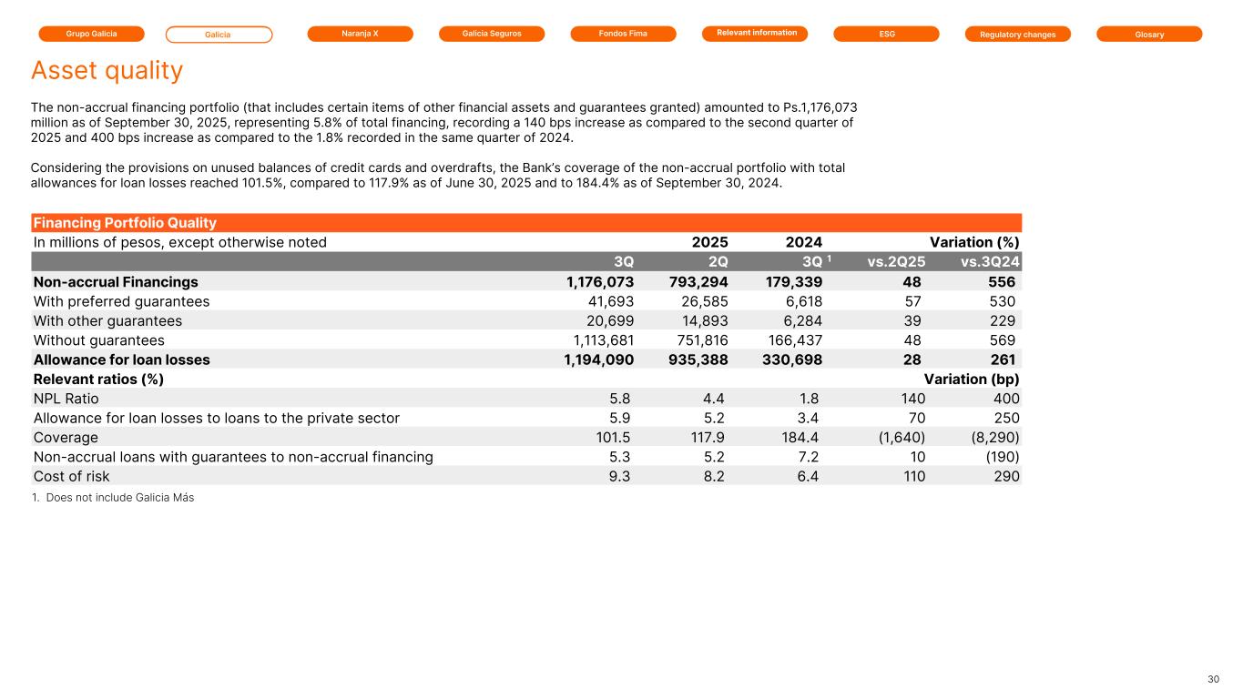 Grupo Galicia Galicia Naranja X Galicia Seguros GlosaryRelevant information ESG Regulatory changesFondos Fima Financing Portfolio Quality In millions of pesos, except otherwise noted 2025 2025 2024 Variation (%) 3Q 2Q 3Q 1 vs.2Q25 vs.3Q24 Non-accrual Financings 1,176,073 793,294 179,339 48 556 With preferred guarantees 41,693 26,585 6,618 57 530 With other guarantees 20,699 14,893 6,284 39 229 Without guarantees 1,113,681 751,816 166,437 48 569 Allowance for loan losses 1,194,090 935,388 330,698 28 261 Relevant ratios (%) Variation (bp) NPL Ratio 5.8 4.4 1.8 140 400 Allowance for loan losses to loans to the private sector 5.9 5.2 3.4 70 250 Coverage 101.5 117.9 184.4 (1,640) (8,290) Non-accrual loans with guarantees to non-accrual financing 5.3 5.2 7.2 10 (190) Cost of risk 9.3 8.2 6.4 110 290 The non-accrual financing portfolio (that includes certain items of other financial assets and guarantees granted) amounted to Ps.1,176,073 million as of September 30, 2025, representing 5.8% of total financing, recording a 140 bps increase as compared to the second quarter of 2025 and 400 bps increase as compared to the 1.8% recorded in the same quarter of 2024. Considering the provisions on unused balances of credit cards and overdrafts, the Bank’s coverage of the non-accrual portfolio with total allowances for loan losses reached 101.5%, compared to 117.9% as of June 30, 2025 and to 184.4% as of September 30, 2024. 30 Asset quality 1. Does not include Galicia Más