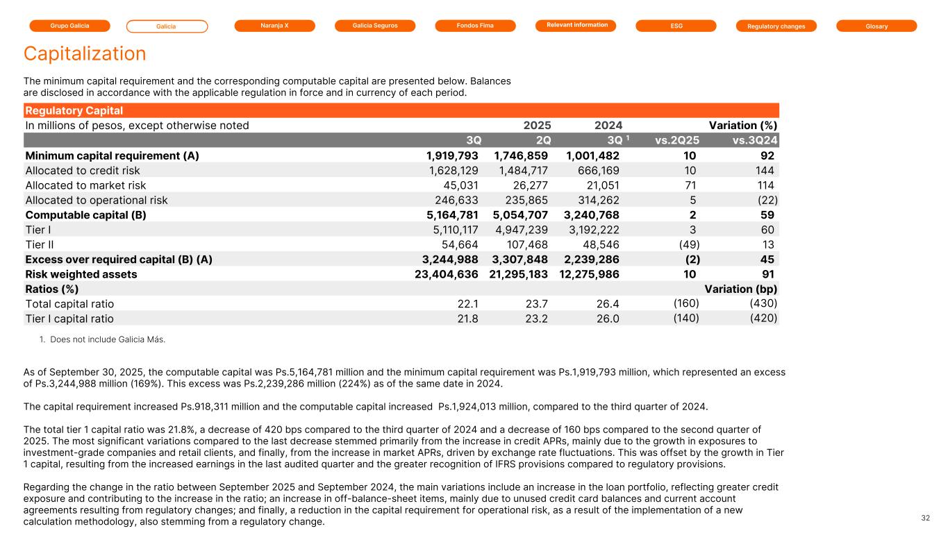 Grupo Galicia Galicia Naranja X Galicia Seguros GlosaryRelevant information ESG Regulatory changesFondos Fima Regulatory Capital In millions of pesos, except otherwise noted 2025 2025 2024 Variation (%) 3Q 2Q 3Q 1 vs.2Q25 vs.3Q24 Minimum capital requirement (A) 1,919,793 1,746,859 1,001,482 10 92 Allocated to credit risk 1,628,129 1,484,717 666,169 10 144 Allocated to market risk 45,031 26,277 21,051 71 114 Allocated to operational risk 246,633 235,865 314,262 5 (22) Computable capital (B) 5,164,781 5,054,707 3,240,768 2 59 Tier I 5,110,117 4,947,239 3,192,222 3 60 Tier II 54,664 107,468 48,546 (49) 13 Excess over required capital (B) (A) 3,244,988 3,307,848 2,239,286 (2) 45 Risk weighted assets 23,404,636 21,295,183 12,275,986 10 91 Ratios (%) Variation (bp) Total capital ratio 22.1 23.7 26.4 (160) (430) Tier I capital ratio 21.8 23.2 26.0 (140) (420) The minimum capital requirement and the corresponding computable capital are presented below. Balances are disclosed in accordance with the applicable regulation in force and in currency of each period. As of September 30, 2025, the computable capital was Ps.5,164,781 million and the minimum capital requirement was Ps.1,919,793 million, which represented an excess of Ps.3,244,988 million (169%). This excess was Ps.2,239,286 million (224%) as of the same date in 2024. The capital requirement increased Ps.918,311 million and the computable capital increased Ps.1,924,013 million, compared to the third quarter of 2024. The total tier 1 capital ratio was 21.8%, a decrease of 420 bps compared to the third quarter of 2024 and a decrease of 160 bps compared to the second quarter of 2025. The most significant variations compared to the last decrease stemmed primarily from the increase in credit APRs, mainly due to the growth in exposures to investment-grade companies and retail clients, and finally, from the increase in market APRs, driven by exchange rate fluctuations. This was offset by the growth in Tier 1 capital, resulting from the increased earnings in the last audited quarter and the greater recognition of IFRS provisions compared to regulatory provisions. Regarding the change in the ratio between September 2025 and September 2024, the main variations include an increase in the loan portfolio, reflecting greater credit exposure and contributing to the increase in the ratio; an increase in off-balance-sheet items, mainly due to unused credit card balances and current account agreements resulting from regulatory changes; and finally, a reduction in the capital requirement for operational risk, as a result of the implementation of a new calculation methodology, also stemming from a regulatory change. 32 Capitalization 1. Does not include Galicia Más.