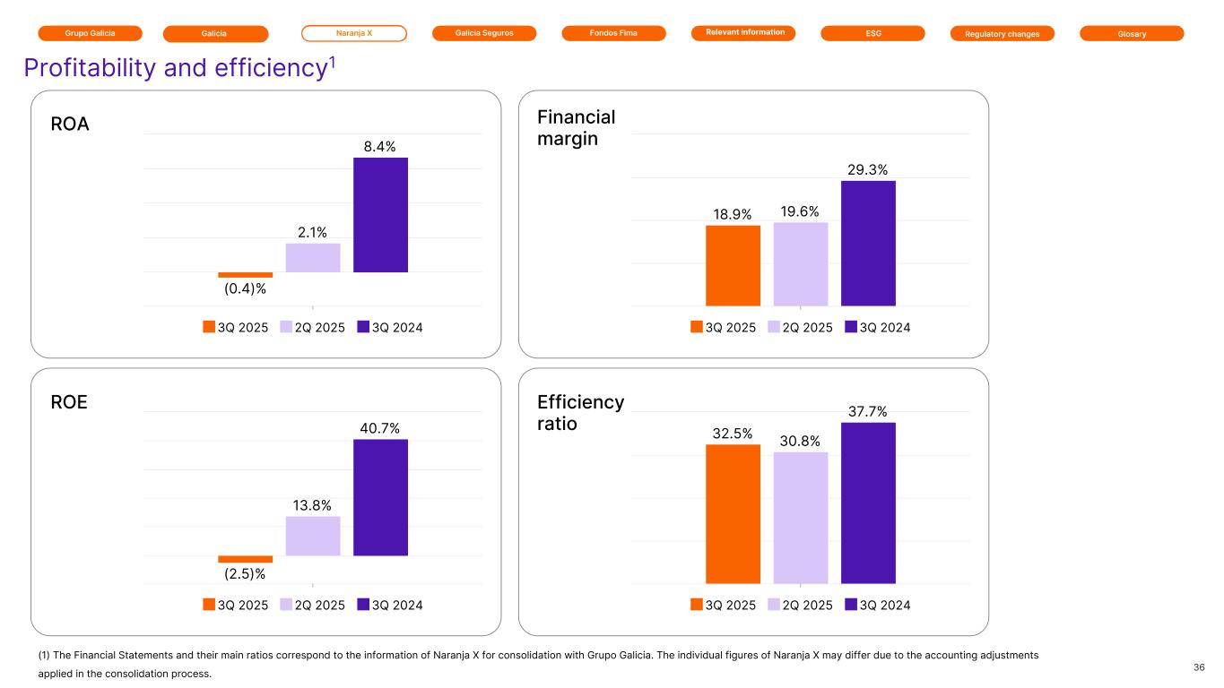 Grupo Galicia Naranja XGalicia Galicia Seguros GlosaryRelevant information ESG Regulatory changesFondos Fima 36 Profitability and efficiency1 Financial margin Efficiency ratio ROA ROE (0.4)% 2.1% 8.4% 3Q 2025 2Q 2025 3Q 2024 (2.5)% 13.8% 40.7% 3Q 2025 2Q 2025 3Q 2024 18.9% 19.6% 29.3% 3Q 2025 2Q 2025 3Q 2024 32.5% 30.8% 37.7% 3Q 2025 2Q 2025 3Q 2024 (1) The Financial Statements and their main ratios correspond to the information of Naranja X for consolidation with Grupo Galicia. The individual figures of Naranja X may differ due to the accounting adjustments applied in the consolidation process.