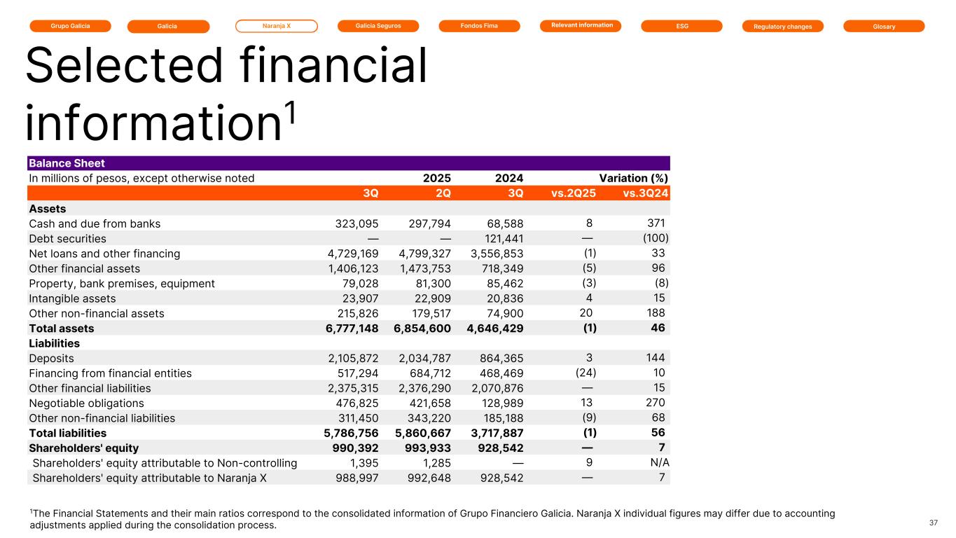 Grupo Galicia Naranja XGalicia Galicia Seguros GlosaryRelevant information ESG Regulatory changesFondos Fima Balance Sheet In millions of pesos, except otherwise noted 2025 2025 2024 Variation (%) 3Q 2Q 3Q vs.2Q25 vs.3Q24 Assets Cash and due from banks 323,095 297,794 68,588 8 371 Debt securities — — 121,441 — (100) Net loans and other financing 4,729,169 4,799,327 3,556,853 (1) 33 Other financial assets 1,406,123 1,473,753 718,349 (5) 96 Property, bank premises, equipment 79,028 81,300 85,462 (3) (8) Intangible assets 23,907 22,909 20,836 4 15 Other non-financial assets 215,826 179,517 74,900 20 188 Total assets 6,777,148 6,854,600 4,646,429 (1) 46 Liabilities Deposits 2,105,872 2,034,787 864,365 3 144 Financing from financial entities 517,294 684,712 468,469 (24) 10 Other financial liabilities 2,375,315 2,376,290 2,070,876 — 15 Negotiable obligations 476,825 421,658 128,989 13 270 Other non-financial liabilities 311,450 343,220 185,188 (9) 68 Total liabilities 5,786,756 5,860,667 3,717,887 (1) 56 Shareholders' equity 990,392 993,933 928,542 — 7 Shareholders' equity attributable to Non-controlling 1,395 1,285 — 9 N/A Shareholders' equity attributable to Naranja X 988,997 992,648 928,542 — 7 37 Selected financial information1 1The Financial Statements and their main ratios correspond to the consolidated information of Grupo Financiero Galicia. Naranja X individual figures may differ due to accounting adjustments applied during the consolidation process.
