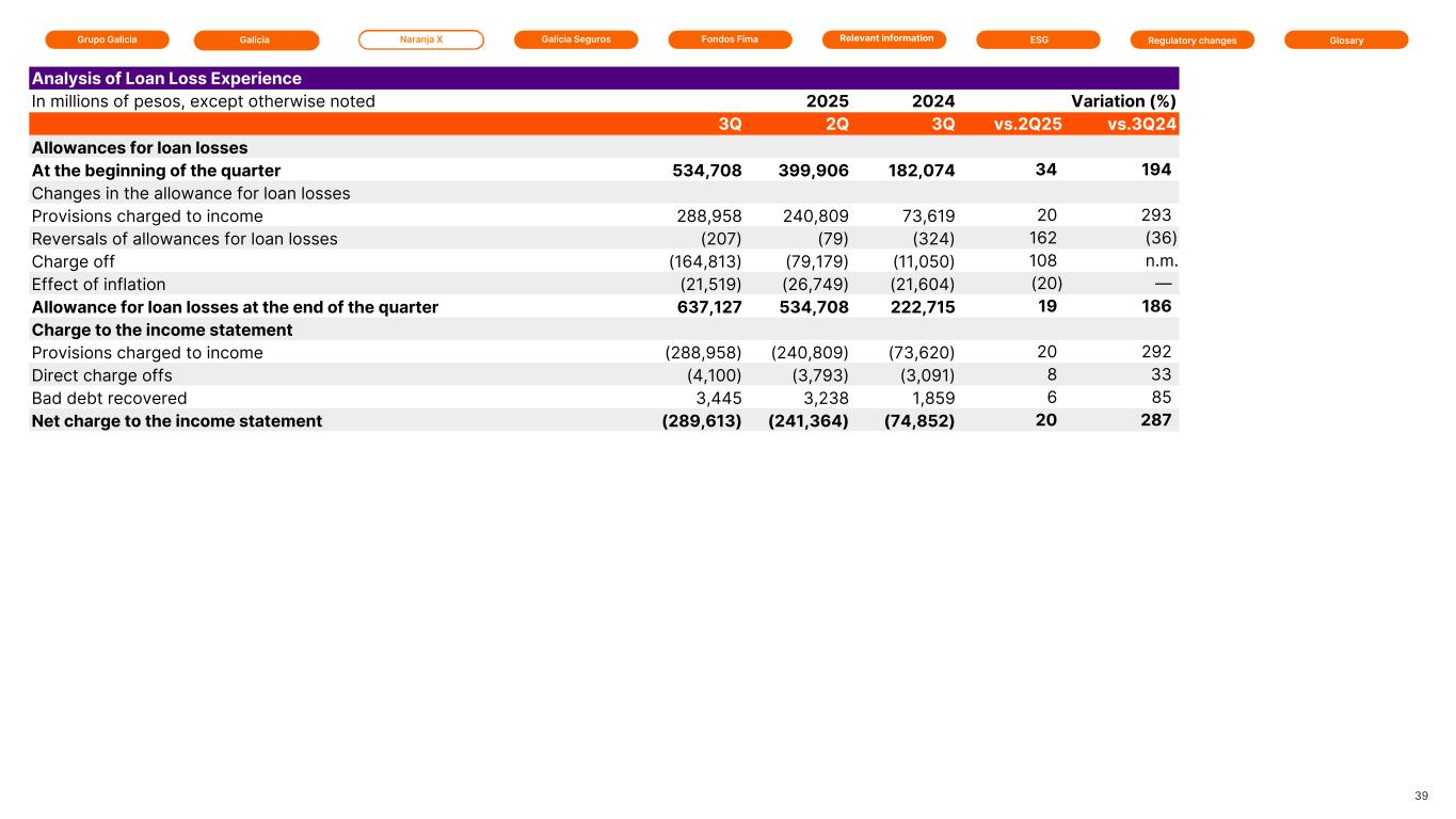 Grupo Galicia Naranja XGalicia Galicia Seguros GlosaryRelevant information ESG Regulatory changesFondos Fima Analysis of Loan Loss Experience In millions of pesos, except otherwise noted 2025 2025 2024 Variation (%) 3Q 2Q 3Q vs.2Q25 vs.3Q24 Allowances for loan losses At the beginning of the quarter 534,708 399,906 182,074 34 194 Changes in the allowance for loan losses Provisions charged to income 288,958 240,809 73,619 20 293 Reversals of allowances for loan losses (207) (79) (324) 162 (36) Charge off (164,813) (79,179) (11,050) 108 n.m. Effect of inflation (21,519) (26,749) (21,604) (20) — Allowance for loan losses at the end of the quarter 637,127 534,708 222,715 19 186 Charge to the income statement Provisions charged to income (288,958) (240,809) (73,620) 20 292 Direct charge offs (4,100) (3,793) (3,091) 8 33 Bad debt recovered 3,445 3,238 1,859 6 85 Net charge to the income statement (289,613) (241,364) (74,852) 20 287 39