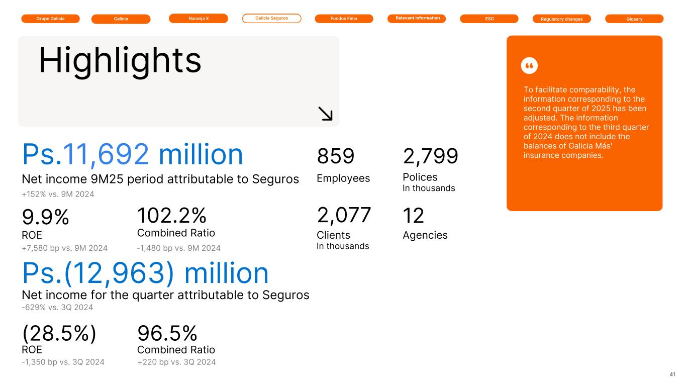 Grupo Galicia Galicia SegurosGalicia Naranja X GlosaryRelevant information ESG Regulatory changesFondos Fima Ps.11,692 million Net income 9M25 period attributable to Seguros +152% vs. 9M 2024 ROE 9.9% +7,580 bp vs. 9M 2024 Combined Ratio 102.2% -1,480 bp vs. 9M 2024 859 2,799 Employees Polices In thousands 41 Clients In thousands Ps.(12,963) million Net income for the quarter attributable to Seguros -629% vs. 3Q 2024 ROE (28.5%) -1,350 bp vs. 3Q 2024 Combined Ratio 96.5% +220 bp vs. 3Q 2024 2,077 Highlights Agencies 12 To facilitate comparability, the information corresponding to the second quarter of 2025 has been adjusted. The information corresponding to the third quarter of 2024 does not include the balances of Galicia Más' insurance companies.