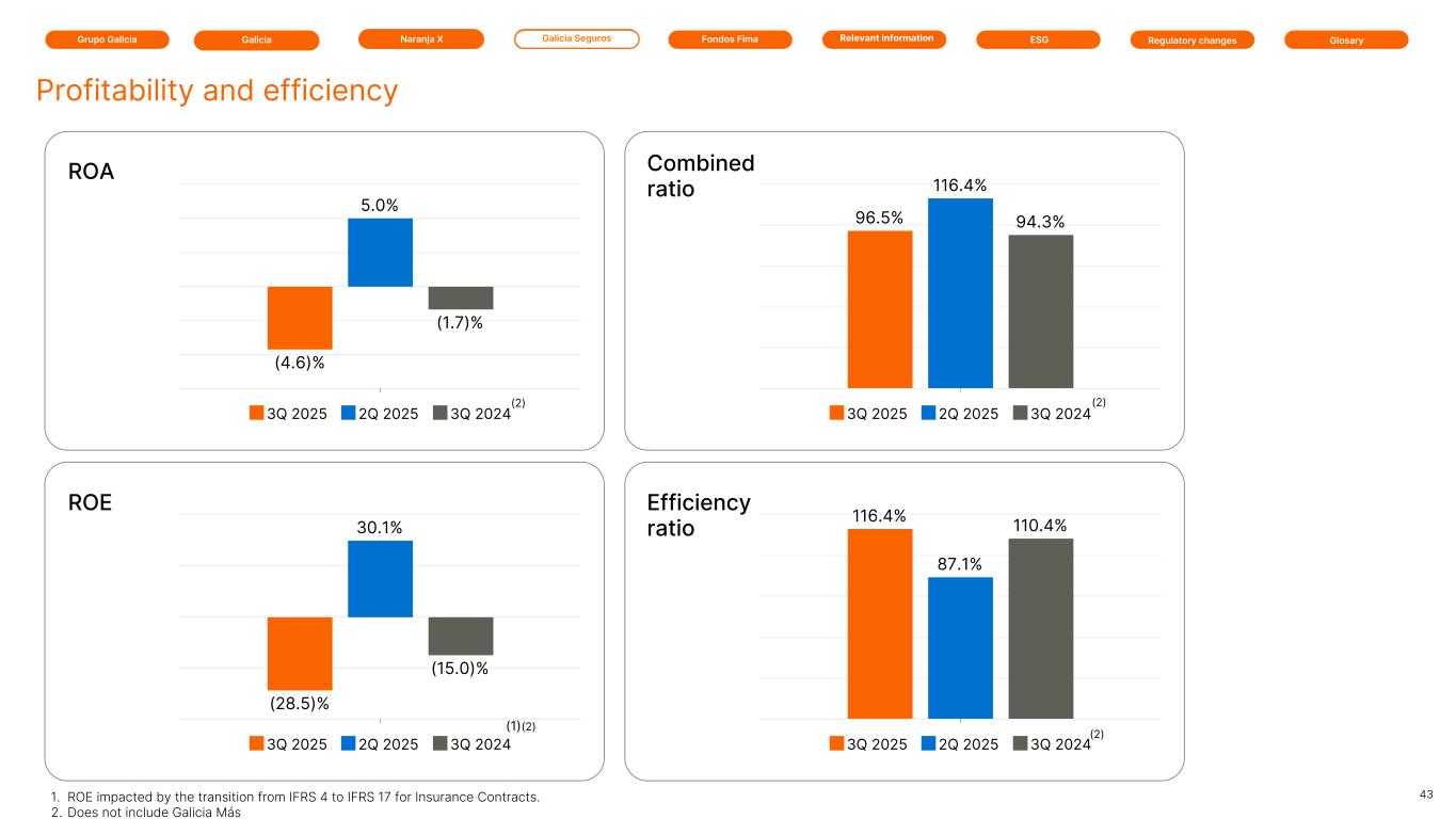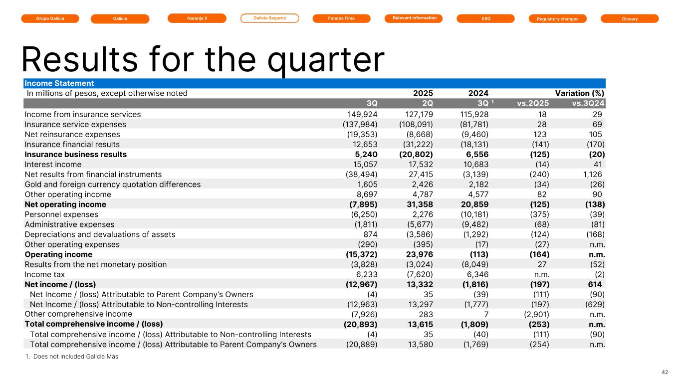 Grupo Galicia Galicia SegurosGalicia Naranja X GlosaryRelevant information ESG Regulatory changesFondos Fima Income Statement In millions of pesos, except otherwise noted 2025 2025 2024 Variation (%) 3Q 2Q 3Q 1 vs.2Q25 vs.3Q24 Income from insurance services 149,924 127,179 115,928 18 29 Insurance service expenses (137,984) (108,091) (81,781) 28 69 Net reinsurance expenses (19,353) (8,668) (9,460) 123 105 Insurance financial results 12,653 (31,222) (18,131) (141) (170) Insurance business results 5,240 (20,802) 6,556 (125) (20) Interest income 15,057 17,532 10,683 (14) 41 Net results from financial instruments (38,494) 27,415 (3,139) (240) 1,126 Gold and foreign currency quotation differences 1,605 2,426 2,182 (34) (26) Other operating income 8,697 4,787 4,577 82 90 Net operating income (7,895) 31,358 20,859 (125) (138) Personnel expenses (6,250) 2,276 (10,181) (375) (39) Administrative expenses (1,811) (5,677) (9,482) (68) (81) Depreciations and devaluations of assets 874 (3,586) (1,292) (124) (168) Other operating expenses (290) (395) (17) (27) n.m. Operating income (15,372) 23,976 (113) (164) n.m. Results from the net monetary position (3,828) (3,024) (8,049) 27 (52) Income tax 6,233 (7,620) 6,346 n.m. (2) Net income / (loss) (12,967) 13,332 (1,816) (197) 614 Net Income / (loss) Attributable to Parent Company’s Owners (4) 35 (39) (111) (90) Net Income / (loss) Attributable to Non-controlling Interests (12,963) 13,297 (1,777) (197) (629) Other comprehensive income (7,926) 283 7 (2,901) n.m. Total comprehensive income / (loss) (20,893) 13,615 (1,809) (253) n.m. Total comprehensive income / (loss) Attributable to Non-controlling Interests (4) 35 (40) (111) (90) Total comprehensive income / (loss) Attributable to Parent Company’s Owners (20,889) 13,580 (1,769) (254) n.m. 42 Results for the quarter 1. Does not included Galicia Más
