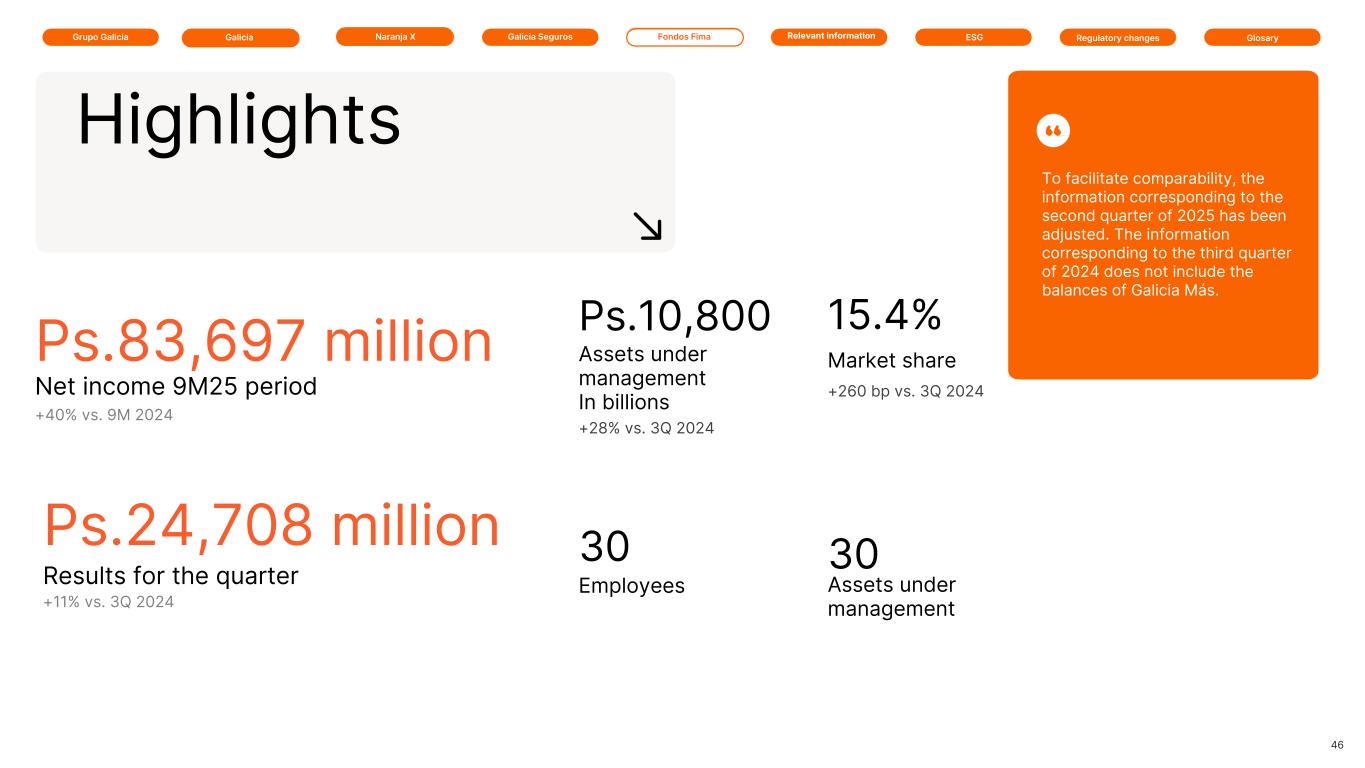Grupo Galicia Galicia Naranja X Galicia Seguros GlosaryRelevant information ESG Regulatory changesFondos Fima Ps.10,800 +28% vs. 3Q 2024 Assets under management In billions 15.4% Market share +260 bp vs. 3Q 2024 30 Employees 46 Assets under management 30 Ps.83,697 million Net income 9M25 period +40% vs. 9M 2024 Highlights Ps.24,708 million Results for the quarter +11% vs. 3Q 2024 To facilitate comparability, the information corresponding to the second quarter of 2025 has been adjusted. The information corresponding to the third quarter of 2024 does not include the balances of Galicia Más.