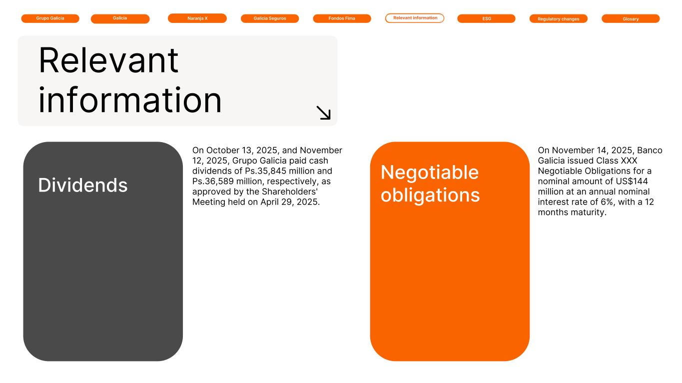 Galicia Naranja X Galicia SegurosGrupo Galicia GlosaryRelevant information ESG Regulatory changesFondos Fima Relevant information Dividends On October 13, 2025, and November 12, 2025, Grupo Galicia paid cash dividends of Ps.35,845 million and Ps.36,589 million, respectively, as approved by the Shareholders' Meeting held on April 29, 2025. Negotiable obligations On November 14, 2025, Banco Galicia issued Class XXX Negotiable Obligations for a nominal amount of US$144 million at an annual nominal interest rate of 6%, with a 12 months maturity.