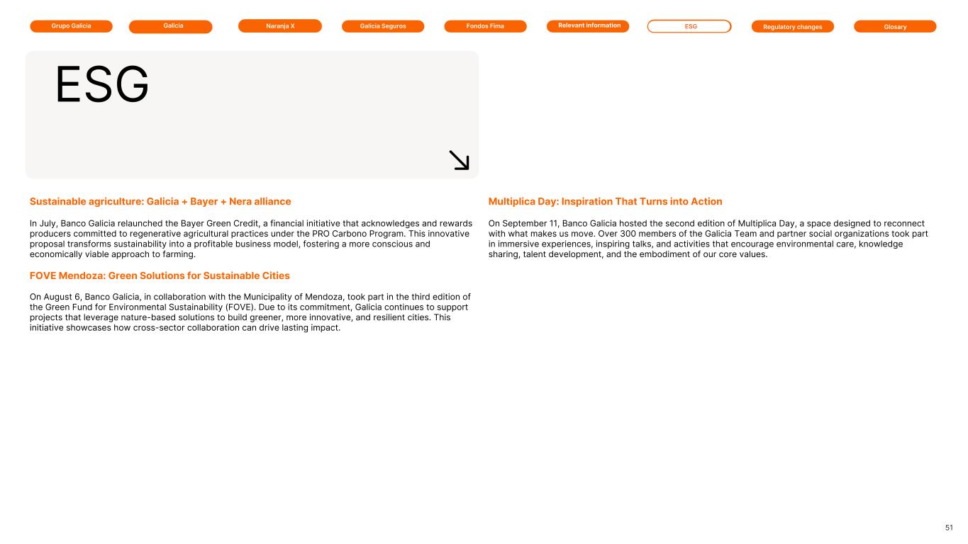 Galicia Naranja X Galicia SegurosGrupo Galicia GlosaryRelevant information ESG Regulatory changesFondos Fima Sustainable agriculture: Galicia + Bayer + Nera alliance In July, Banco Galicia relaunched the Bayer Green Credit, a financial initiative that acknowledges and rewards producers committed to regenerative agricultural practices under the PRO Carbono Program. This innovative proposal transforms sustainability into a profitable business model, fostering a more conscious and economically viable approach to farming. FOVE Mendoza: Green Solutions for Sustainable Cities On August 6, Banco Galicia, in collaboration with the Municipality of Mendoza, took part in the third edition of the Green Fund for Environmental Sustainability (FOVE). Due to its commitment, Galicia continues to support projects that leverage nature-based solutions to build greener, more innovative, and resilient cities. This initiative showcases how cross-sector collaboration can drive lasting impact. ESG 51 Multiplica Day: Inspiration That Turns into Action On September 11, Banco Galicia hosted the second edition of Multiplica Day, a space designed to reconnect with what makes us move. Over 300 members of the Galicia Team and partner social organizations took part in immersive experiences, inspiring talks, and activities that encourage environmental care, knowledge sharing, talent development, and the embodiment of our core values.