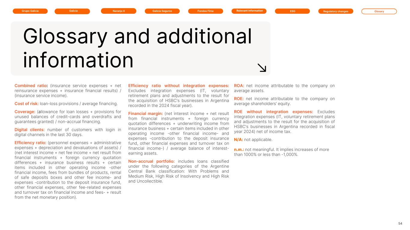 Galicia Naranja X Galicia SegurosGrupo Galicia GlosaryRelevant information ESG Regulatory changesFondos Fima Combined ratio: (insurance service expenses + net reinsurance expenses + insurance financial results) / (insurance service income). Cost of risk: loan-loss provisions / average financing. Coverage: (allowance for loan losses + provisions for unused balances of credit-cards and overdrafts and guarantees granted) / non-accrual financing. Digital clients: number of customers with login in digital channels in the last 30 days. Efficiency ratio: (personnel expenses + administrative expenses + depreciation and devaluations of assets) / (net interest income + net fee income + net result from financial instruments + foreign currency quotation differences + insurance business results + certain items included in other operating income -other financial income, fees from bundles of products, rental of safe deposits boxes and other fee income- and expenses -contribution to the deposit insurance fund, other financial expenses, other fee-related expenses and turnover tax on financial income and fees- + result from the net monetary position). ROA: net income attributable to the company on average assets. ROE: net income attributable to the company on average shareholders’ equity. ROE without integration expenses: Excludes integration expenses (IT, voluntary retirement plans and adjustments to the result for the acquisition of HSBC's businesses in Argentina recorded in fiscal year 2024) net of income tax. N/A: not applicable. n.m.: not meaningful. It implies increases of more than 1000% or less than -1,000%. 54 Glossary and additional information Efficiency ratio without integration expenses: Excludes integration expenses (IT, voluntary retirement plans and adjustments to the result for the acquisition of HSBC's businesses in Argentina recorded in the 2024 fiscal year). Financial margin: (net interest income + net result from financial instruments + foreign currency quotation differences + underwriting income from insurance business + certain items included in other operating income -other financial income- and expenses -contribution to the deposit insurance fund, other financial expenses and turnover tax on financial income-) / average balance of interest- earning assets. Non-accrual portfolio: includes loans classified under the following categories of the Argentine Central Bank classification: With Problems and Medium Risk, High Risk of Insolvency and High Risk and Uncollectible.