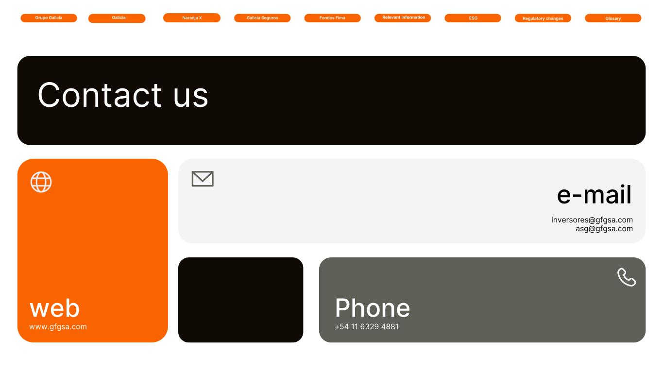 Galicia Naranja X Galicia SegurosGrupo Galicia GlosaryRelevant information ESG Regulatory changesFondos Fima Contact us www.gfgsa.com +54 11 6329 4881 inversores@gfgsa.com asg@gfgsa.com web Phone e-mail