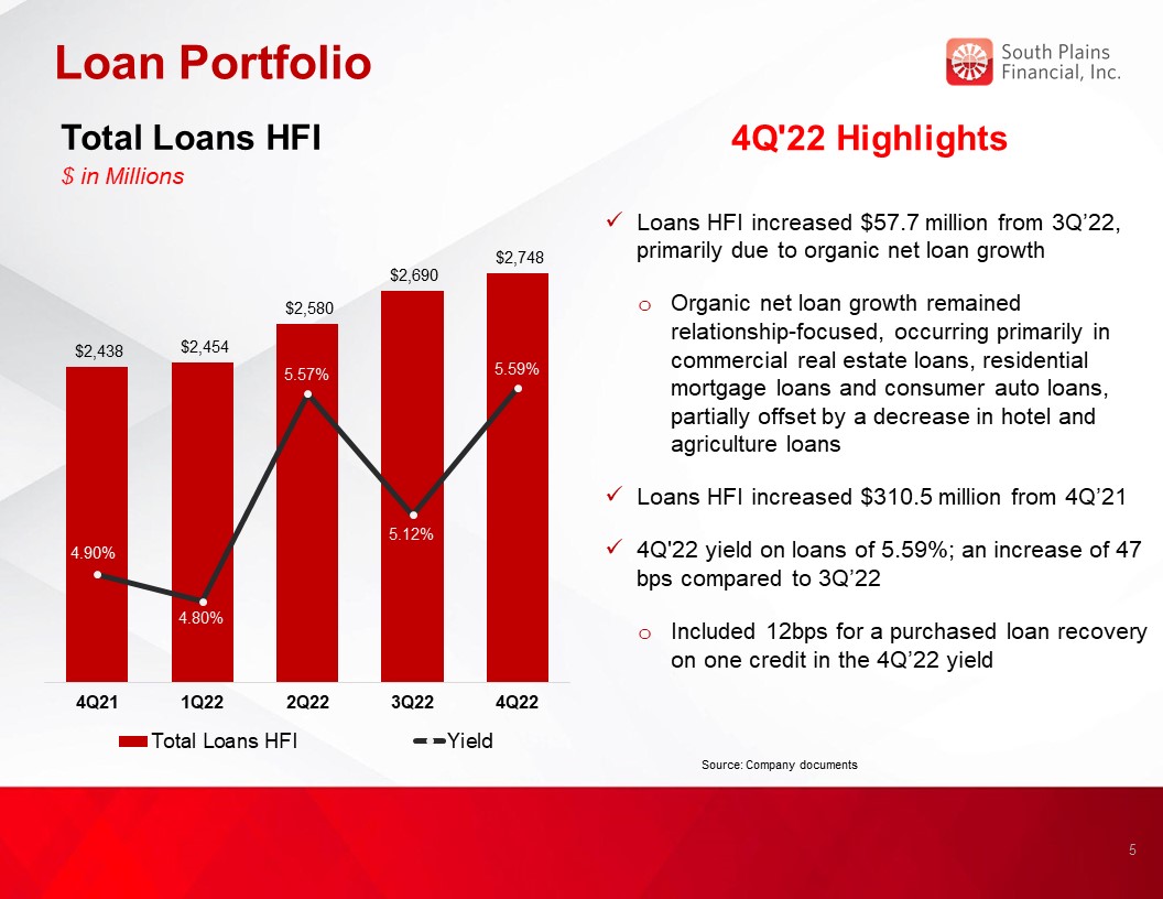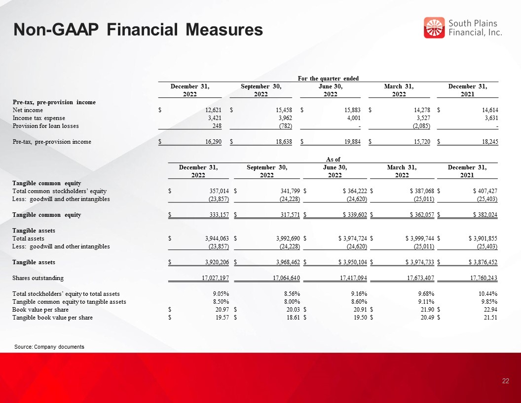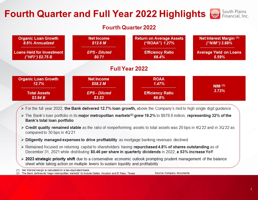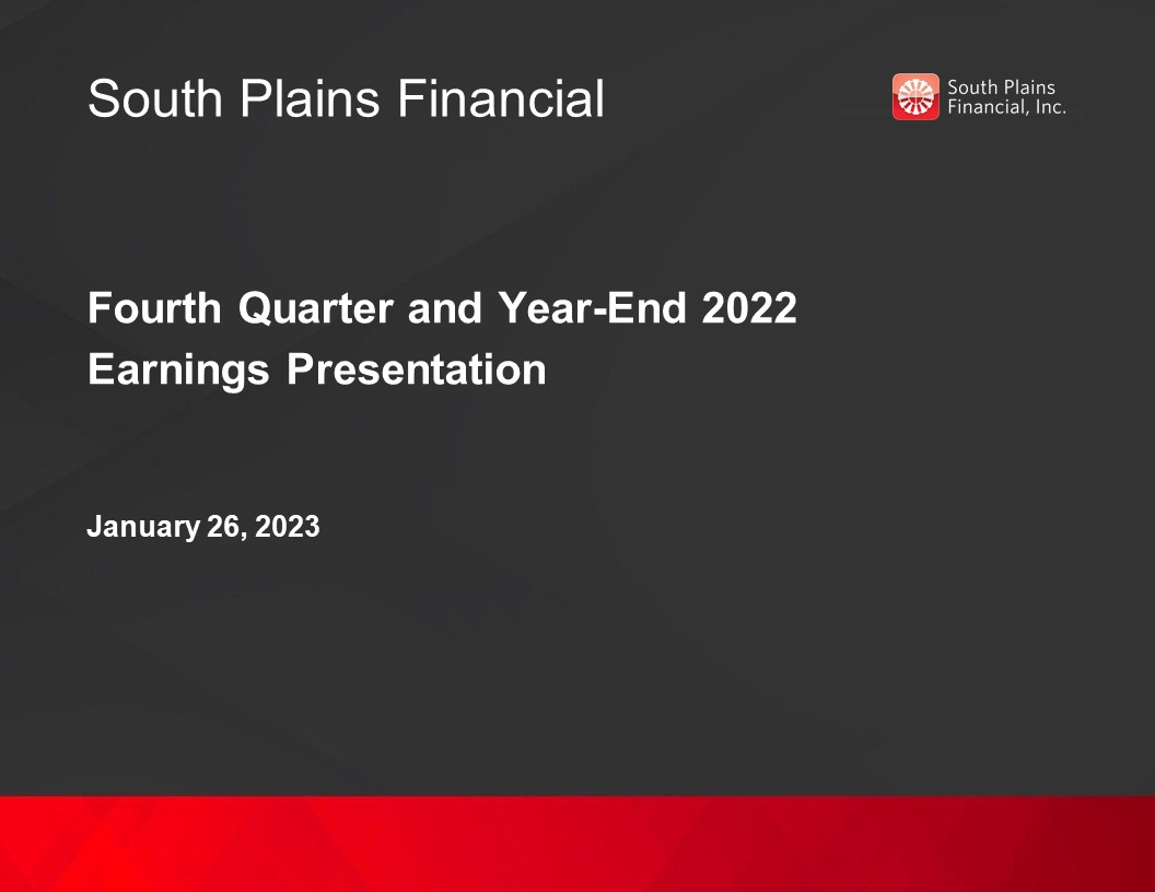LUBBOCK, Texas, January 26, 2023 (GLOBE NEWSWIRE) - City Bank(以下「シティバンク」または「銀行」)の親会社であるSouth Plains Financial, Inc. (NASDAQ:SPFI) (「サウスプレインズ」または「当社」)は、本日2022年12月末の四半期および年間の決算について報告しました。