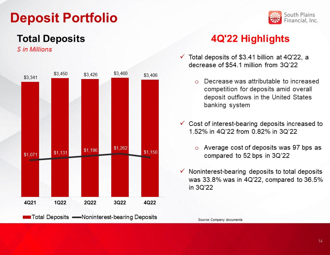 2022 年第 4 四半期の平均預金コストは、2022 年第 3 四半期の 52bp、2021 年第 4 四半期の 23bp に対し、97bp に増加しました。 |