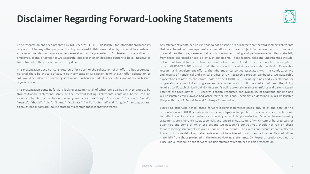 our expectations regarding potential benefits of our GH001 and GH002 product candidates and our approach generally;