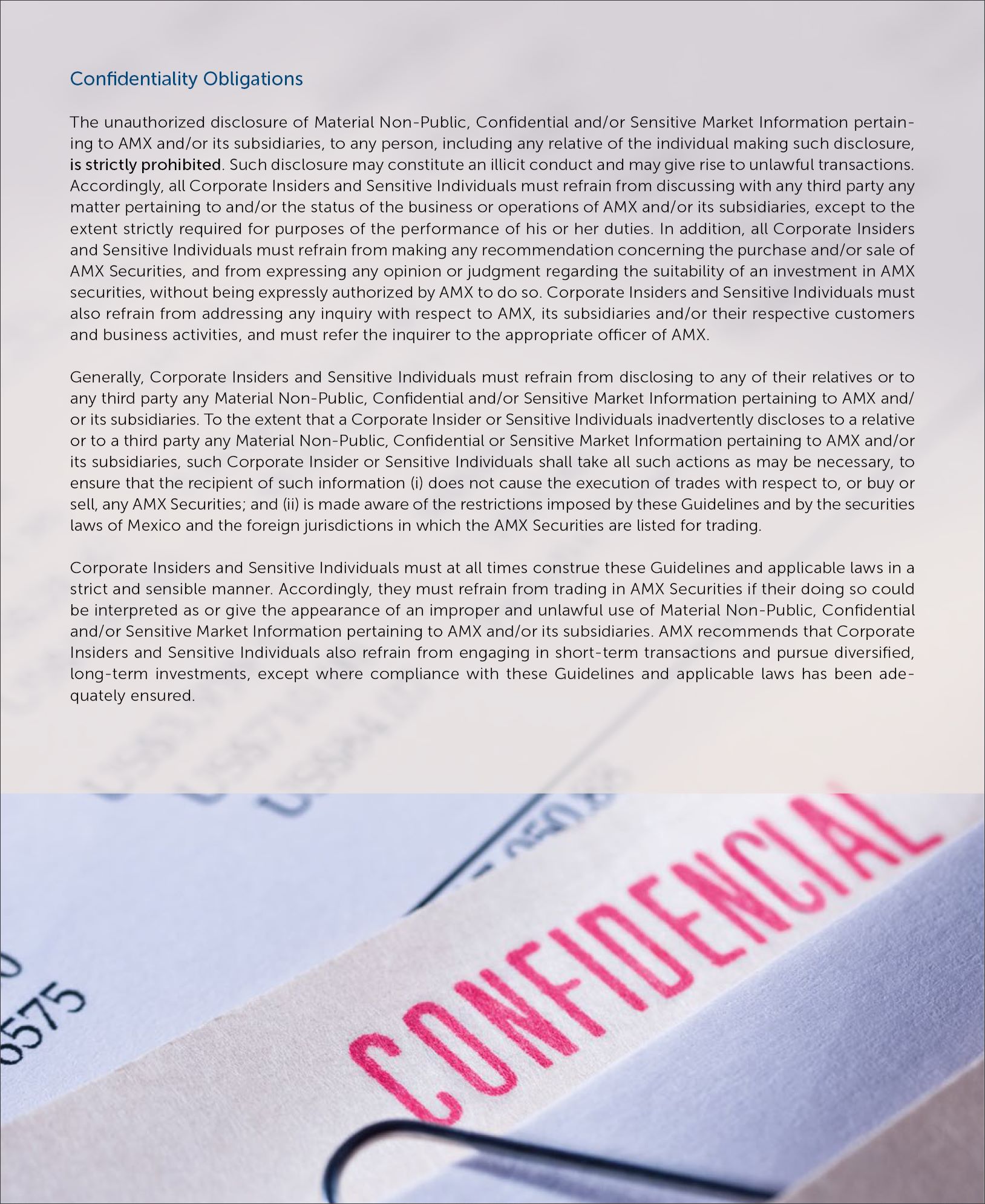 Employees must refrain from having confidential conversations of any kind in public places, as well as to avoid any undue release through media like the Internet, social media or