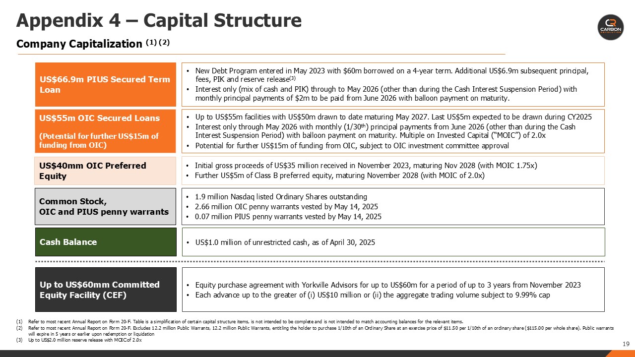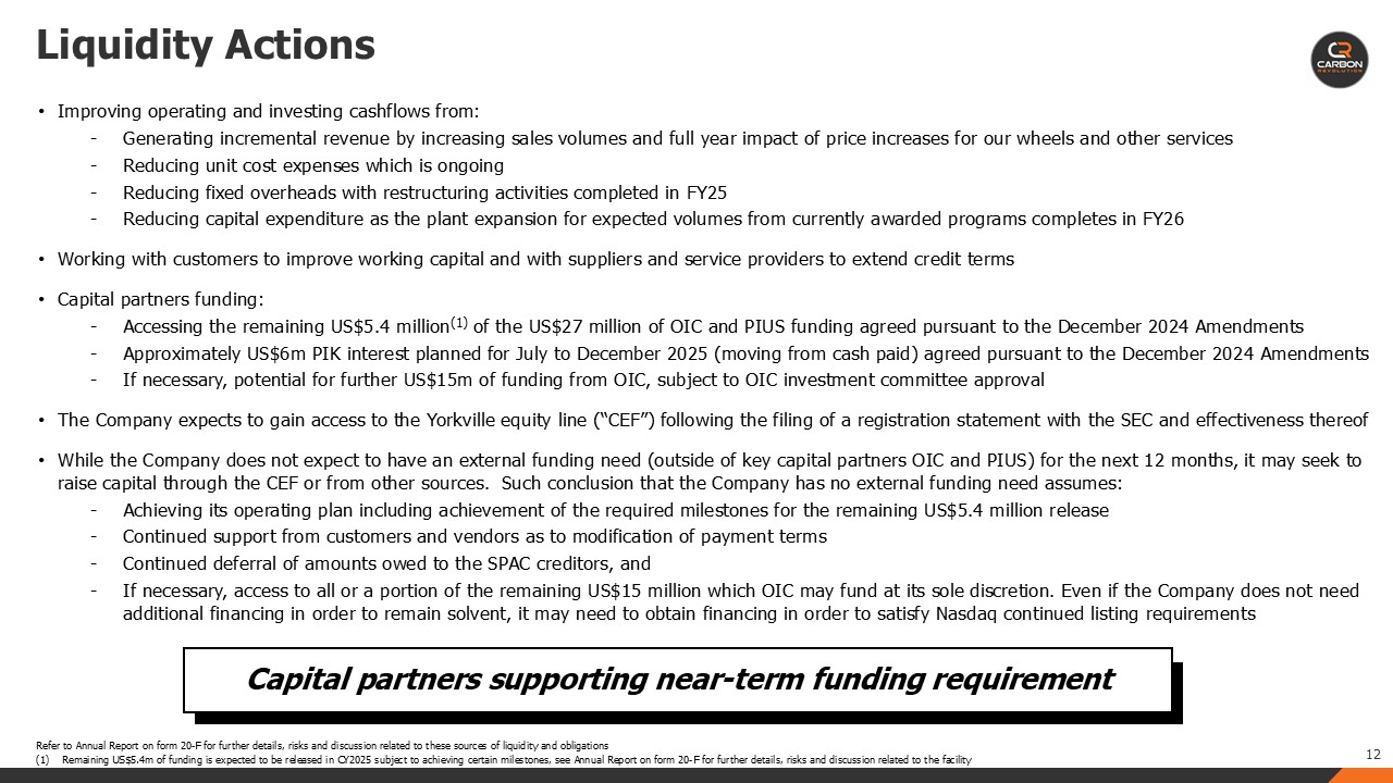 The Company expects to draw down the remaining US$5m from OIC funds in CY2025. As of April 30, 2025 the Company has US$1.0m of available cash on the balance sheet and US$3.6m in restricted Trust fund in relation to the PIUS agreement.