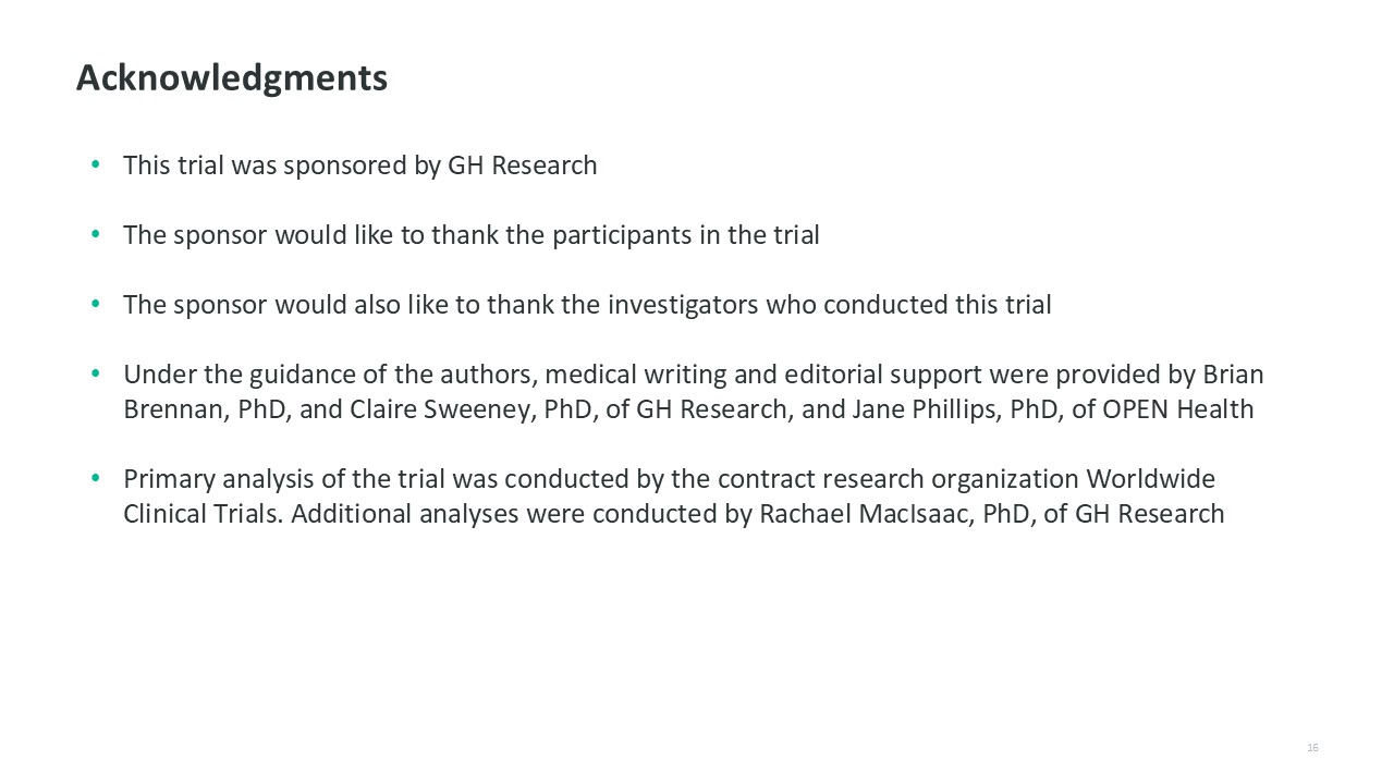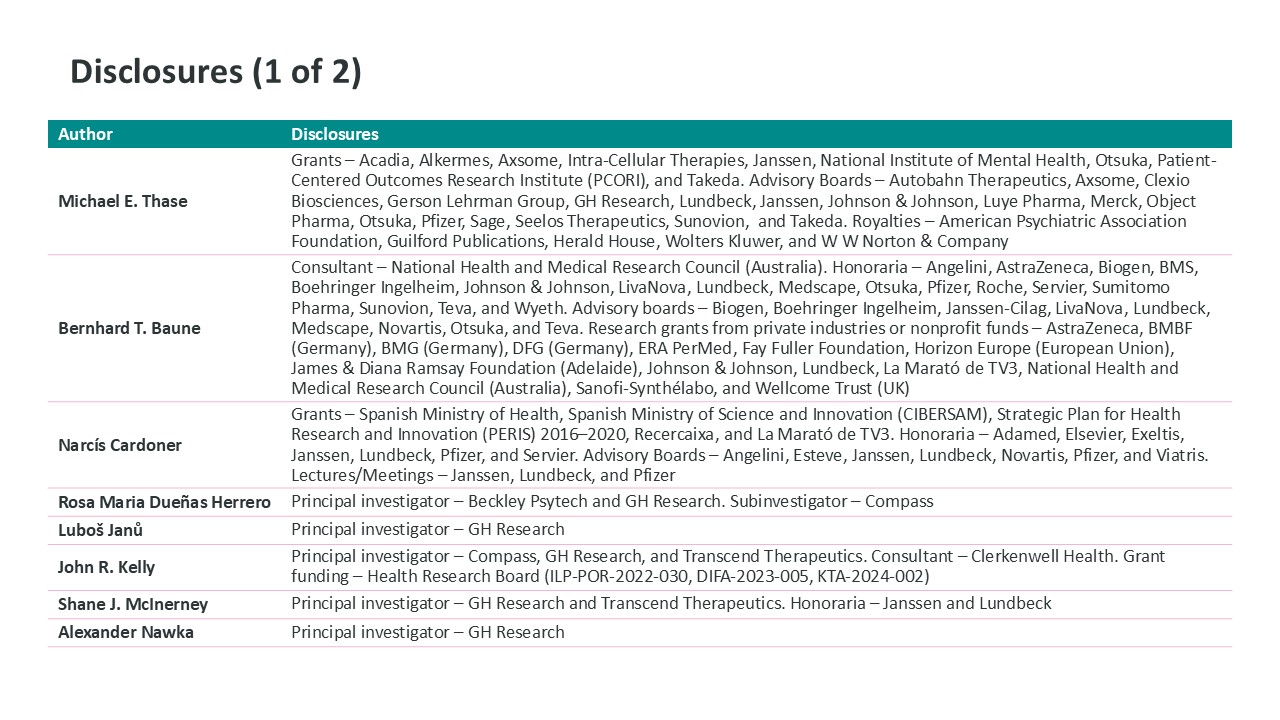Pharmaceuticals, GH Research, Janssen, MSD, and Novartis (relationships reported within the last three years) Disclosures (2 of 2)