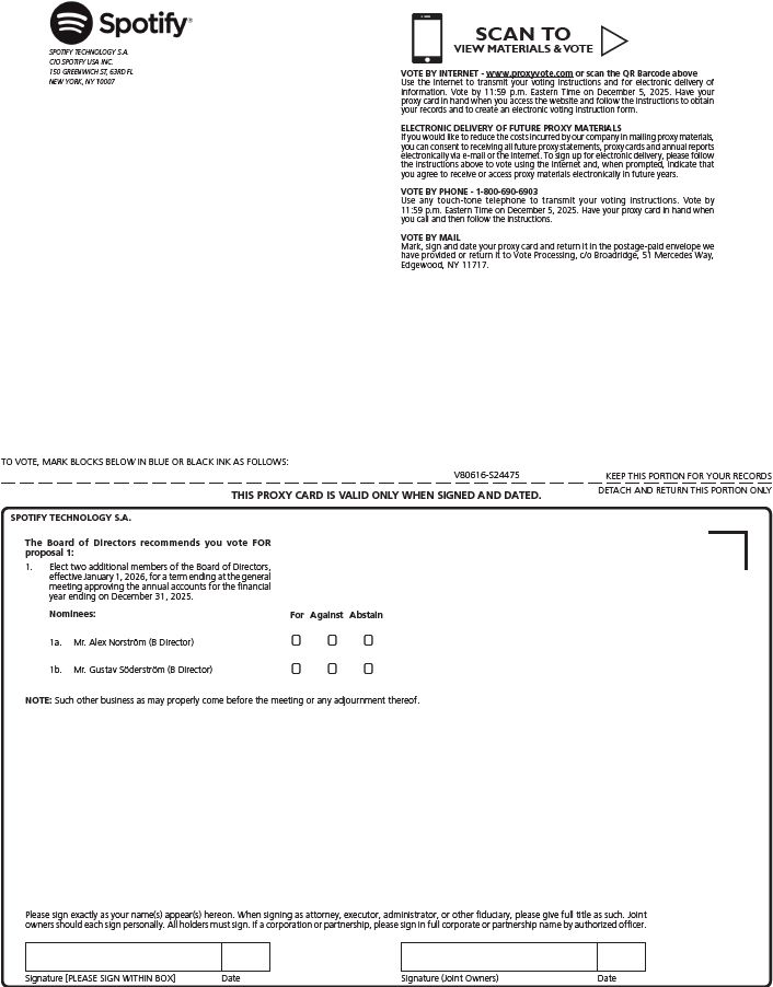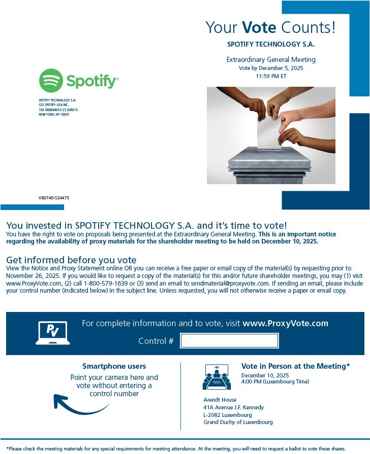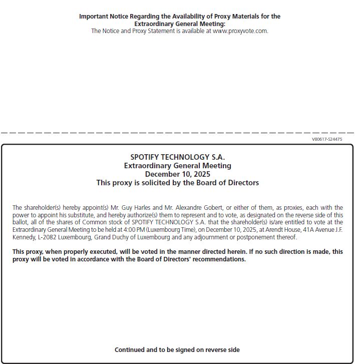 You are cordially invited to attend an extraordinary general meeting of shareholders and holders of beneficiary certificates (the “Extraordinary General Meeting”) of Spotify Technology S.A. (the “Company”) to be held at 4:00 p.m. Luxembourg time on December 10, 2025 at Arendt House, 41A, avenue J.F. Kennedy, L-2082 Luxembourg, Grand Duchy of Luxembourg. Information concerning the matters to be considered and voted upon at the Extraordinary General Meeting is set out in the attached Convening Notice and Proxy Statement.