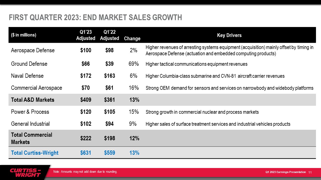 「カーティスライトは、新規受注、売上高、営業利益、希薄化後EPSの2桁成長により、2023年第1四半期に力強い業績を達成しました」と、カーティスライト・コーポレーション会長兼CEOのリン・M・バンフォードは述べています。「各末端市場での売上高が増加し、卓越した商業活動を継続することで、営業利益率を20bp拡大し、調整後希薄化後EPSを17%成長させることができました。航空宇宙・防衛市場の売上高は、防衛エレクトロニクスのサプライチェーンがある程度安定したことと、エンジニアド・アレスティング・システム事業が第4四半期も堅調だったことを反映して、当四半期に13%増加しました。" 商業市場の売上高は、商業原子力、プロセス、一般産業市場の強い需要から引き続き利益を得て、12%増加しました。