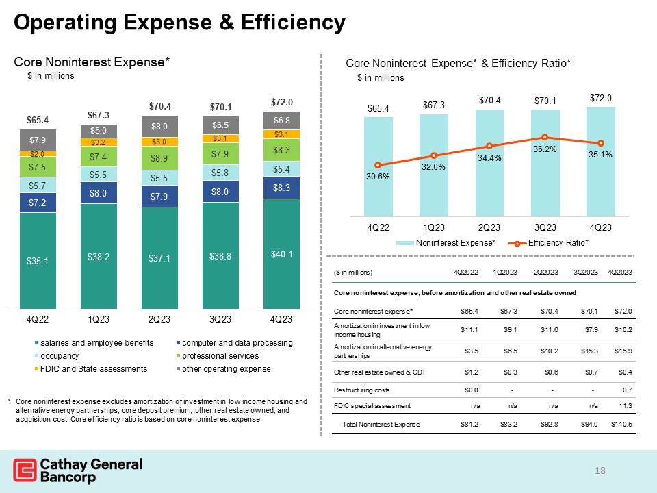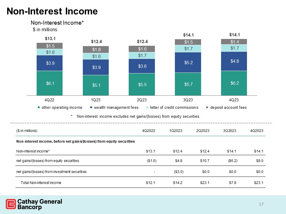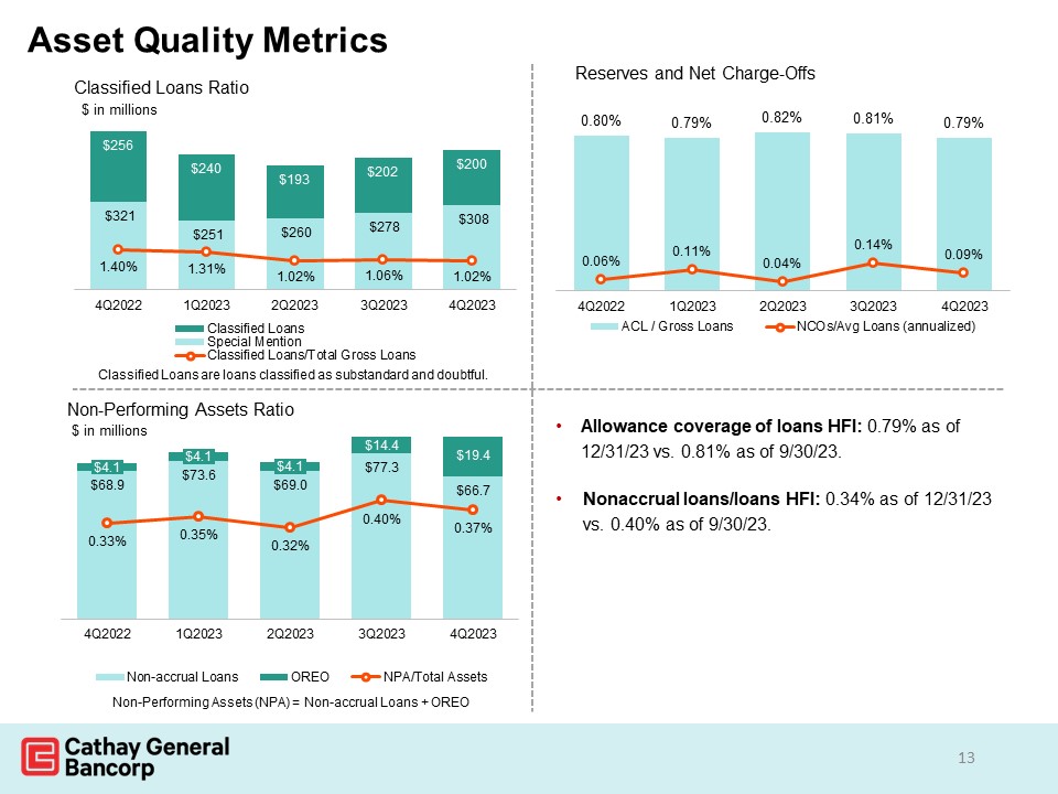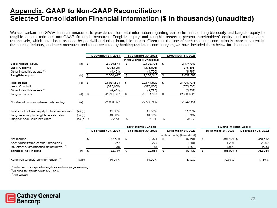 LOS ANGELES--(BUSINESS WIRE)--January 24, 2024--Cathay General Bancorp (the “Company”, “we”, “us”, or “our”) (Nasdaq: CATY), the holding company for Cathay Bank, today announced its unaudited financial results for the quarter and year ended December 31, 2023. The Company reported net income of $354.1 million, or $4.86 per share, for the year ended December 31, 2023 and net income of $82.5 million, or $1.13 per share, for the fourth quarter of 2023. The fourth quarter net income included a $11.3 million, or $0.12 per diluted share, charge for the one-time FDIC special assessment.