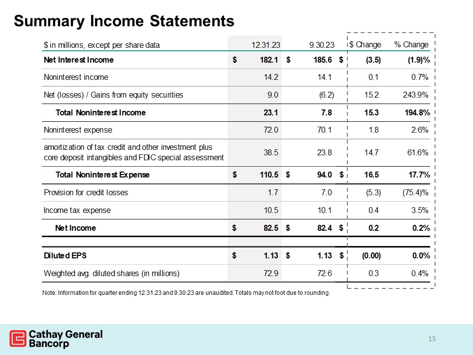 Net income for the quarter ended December 31, 2023, was $82.5 million, an increase of $0.1 million, or 0.1%, compared to net income of $82.4 million for the third quarter of 2023. Diluted earnings per share for the fourth quarter of 2023 was $1.13 per share compared to $1.13 per share for the third quarter of 2023. Net income for the fourth quarter included an $11.3 million, or $0.12 per diluted share, one-time FDIC special assessment as a result of the Federal Deposit Insurance Act.