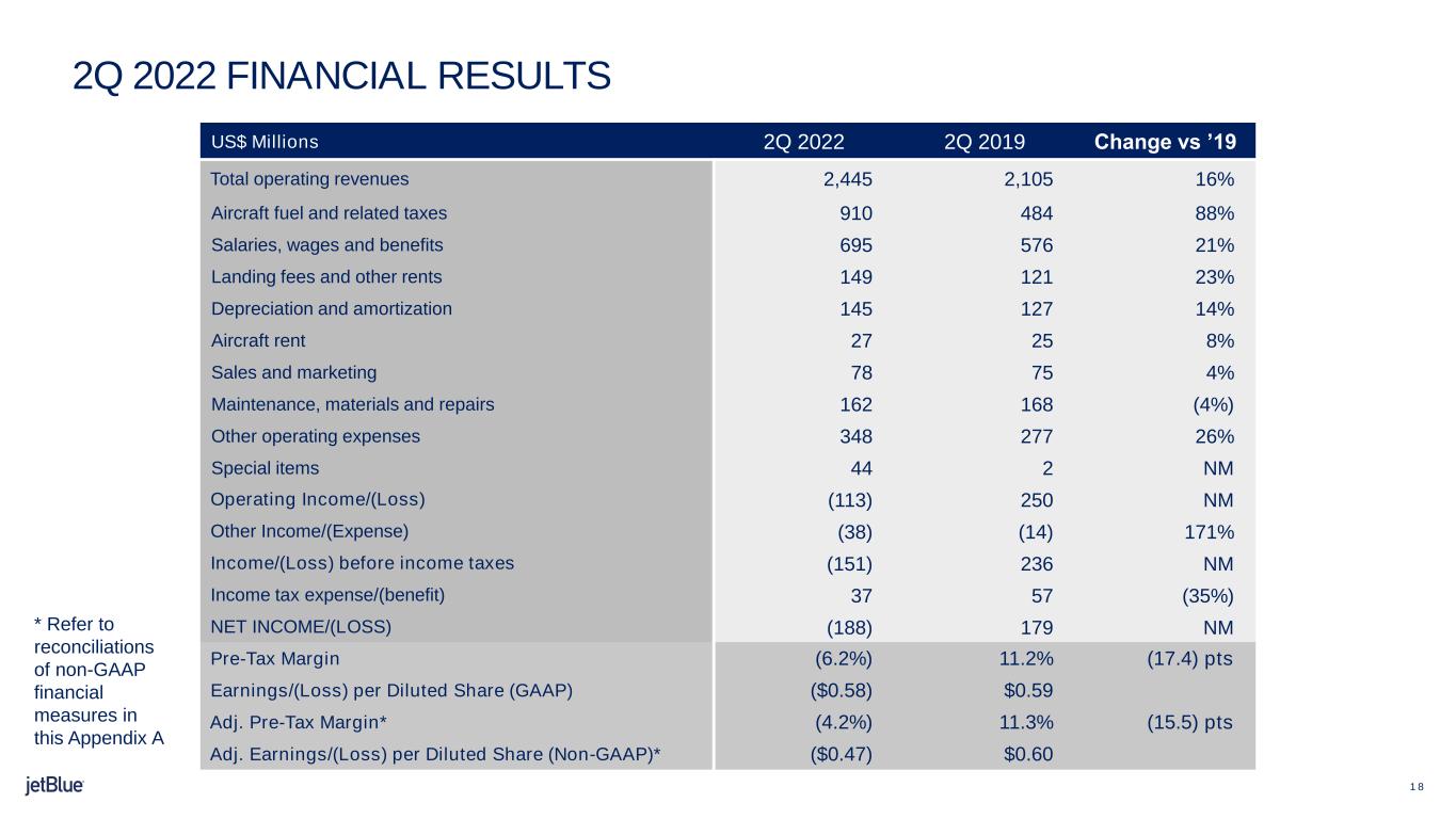 •JetBlue ended the second quarter of 2022 with approximately $2.6 billion in unrestricted cash, cash equivalents, short-term investments, and long-term marketable securities, or 32% of 2019 revenue. This excludes our $550 million undrawn revolving credit facility.
