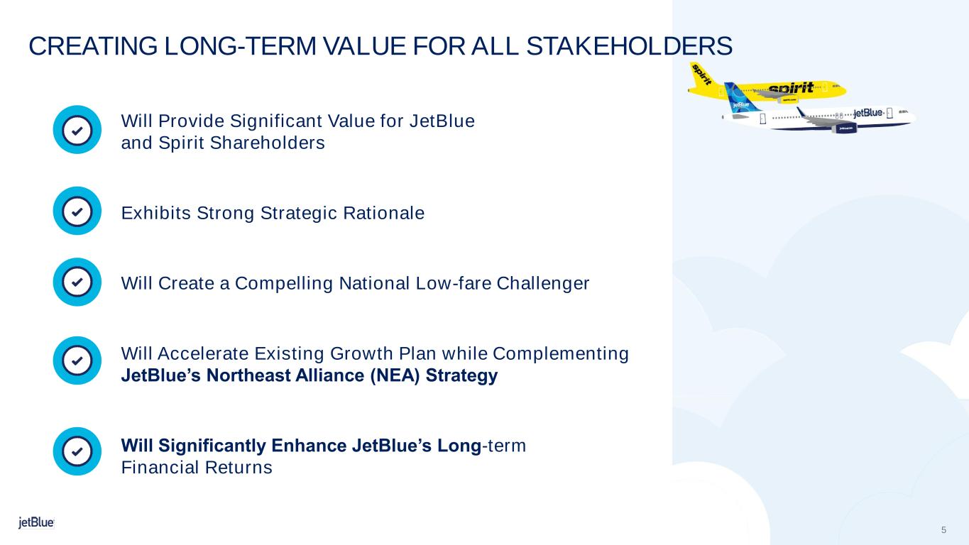 -ジェットブルーは、統合後のネットワークの幅と深さがもたらす顧客サービスの拡充を主な要因として、統合完了後に年間6億ドルから7億ドルの純相乗効果を達成することを見込んでいます。ジェットブルーは、この統合により、統合後最初の1年間は1株当たり利益が大幅に増加すると見込んでいます。また、買収後のレバレッジは3.0~3.5倍と過去の水準を大幅に下回るため、バランスシートの柔軟性を維持し、シナジーを獲得しながらレバレッジの削減を継続する予定です。